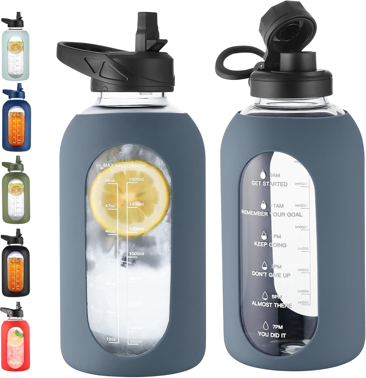 - HALF GALLON CAPACITY WATER BOTTLE: Large water bottle ensures you enjoy enough water without having to refill it frequently. It's perfect for an on-the-go lifestyle! 32 oz, 40oz, 64 oz capacity glass water bottles that meet your different hydrating need