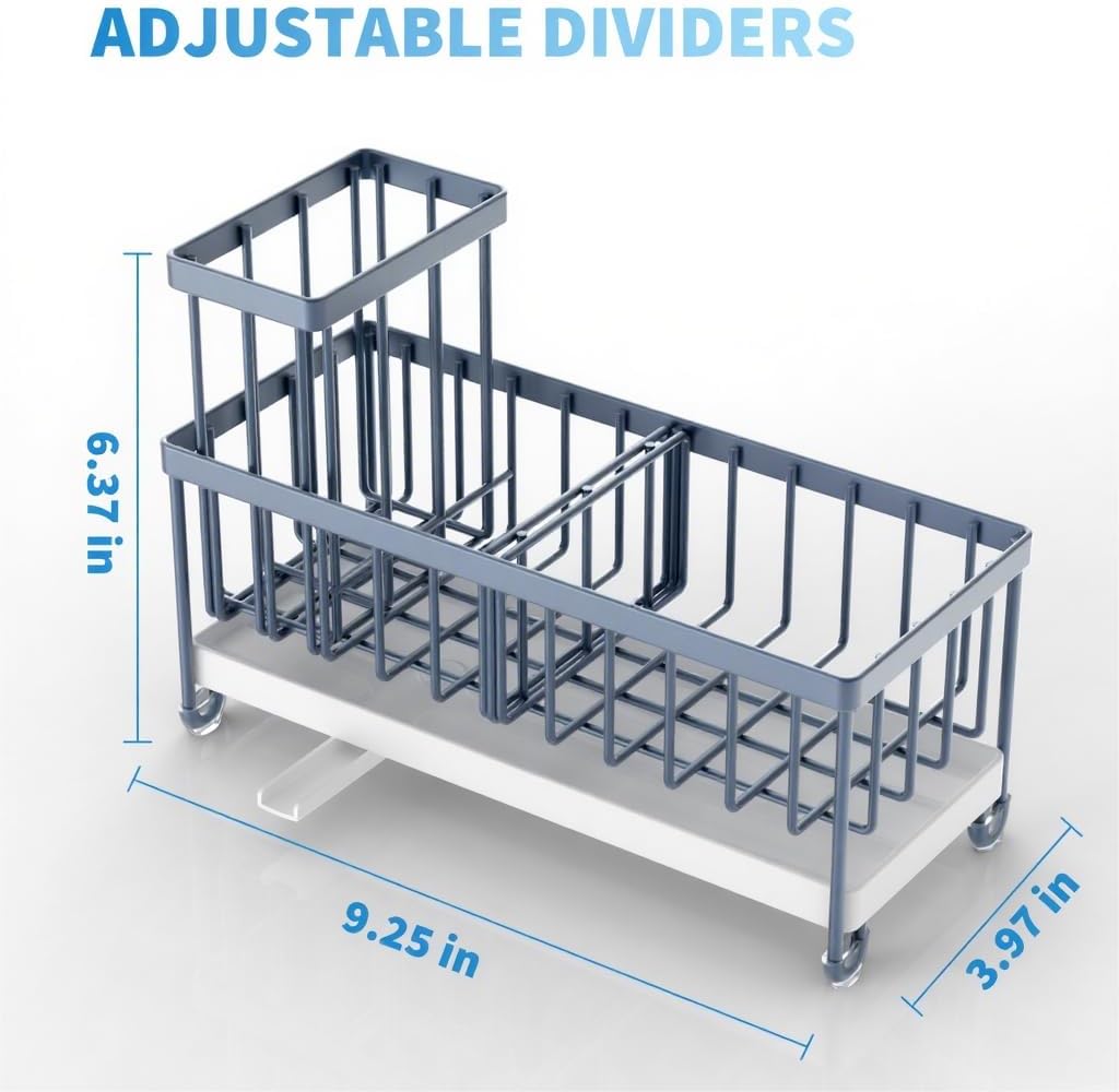 Cisily Blue Gray Sponge Holder for Kitchen Sink, Sink Caddy Organizer with High Brush Holder, Kitchen Countertop Organizers and Storage Essentials, Rustproof 304 Stainless Steel, Soap Dispenser