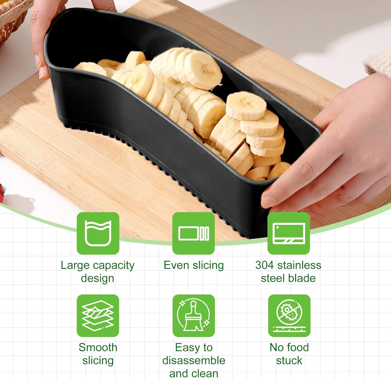 - 4. Effortless & Safe to Use – Simply place your banana, strawberry, or other ingredients into the slicer and press down for instant, uniform cuts. No more messy chopping or uneven slices—just quick, consistent results with no risk of knife slips!
