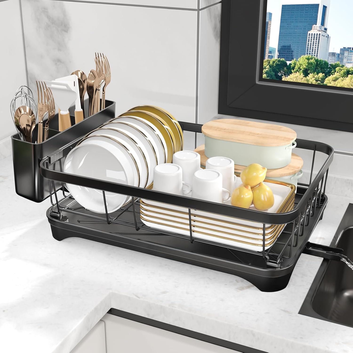 Dish Drying Rack for Kitchen Counter – Large Capacity Single Tier Dish Drainer with Utensil Holder & Cutlery Tray, Space Saving Countertop Organizer, Black