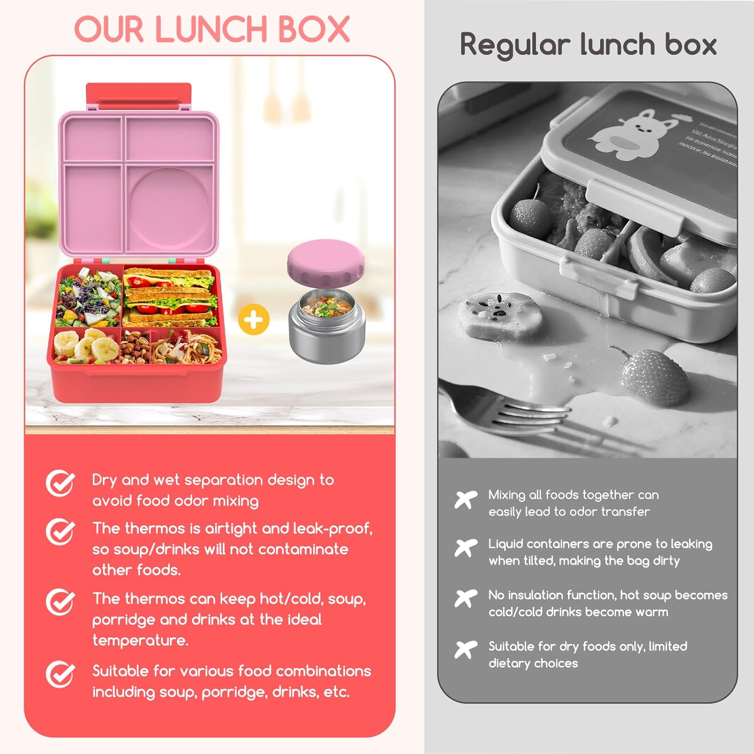 - Bento Box for Kids: This bento box set includes 1 Lunch box, 1 Thermos insert, 1Spoon, 1 Fork and 1 Removable divider. The perfect combination of lunch box and thermos can make children's daily diet more nutritionally balanced, whether it is school lunch, outdoor picnic or long journey. Recommended Age Grade- 3+ Years of Age.