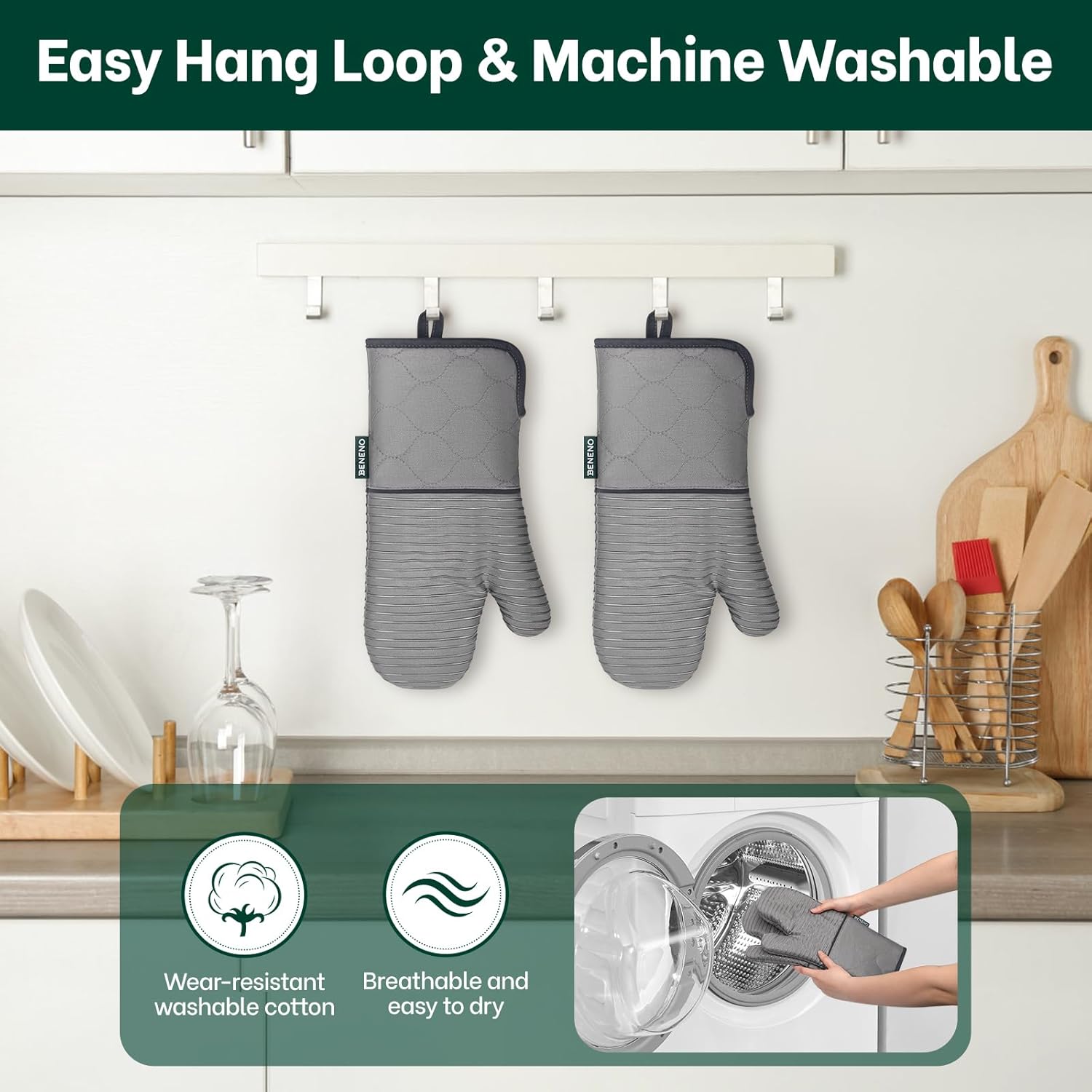 - Non-Slip Flexible Grip: Designed for maximum safety grip, these oven mitts feature advanced silicone textured stripes that lock onto hot, wet, or oily cookware with no slips. The flexible cotton-silicone hybrid design moves with your hands naturally, giving you both the stability to safely transfer heavy pans and the precision to handle delicate tasks like baking or adjusting oven racks