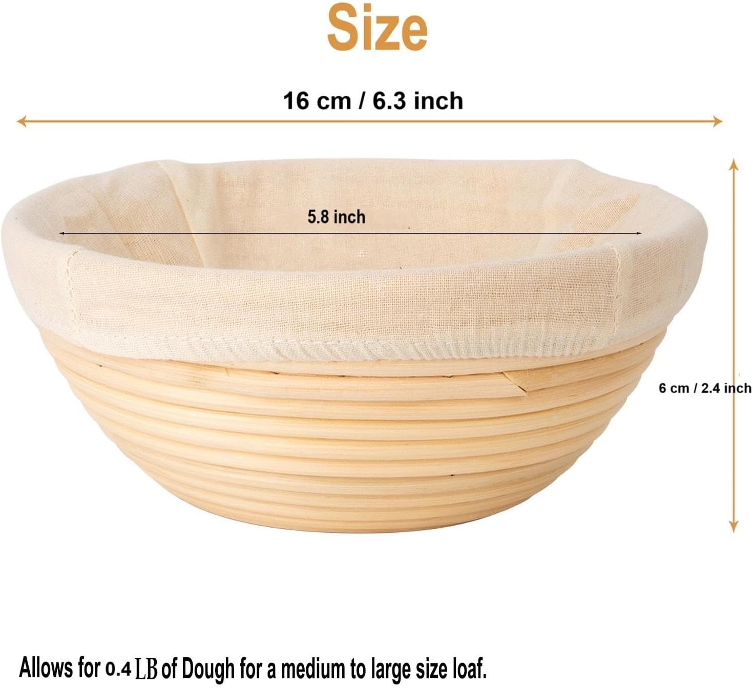 - Perfect Size for Baking Bread: 4 PCS 6 inch (D) x 2.4 inch (H) size round bread proofing basket, which each pieces can hold up to 0.4 pounds of dough, works well with any recipe involving Flour Water Salt and Yeast etc. This bread proofing bowl is capable of proving overnight in the fridge with a tightly cover bag.