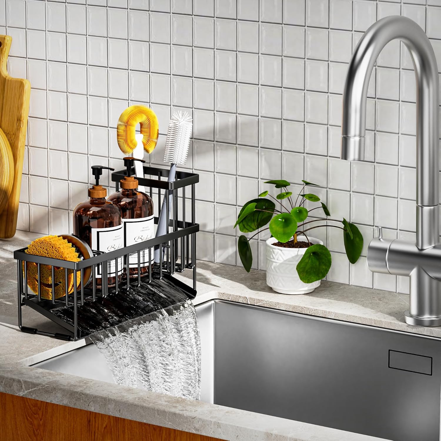 - 【REASONABLE DIVIDER DESIGN】 The sponge holder for kitchen sink ergonomic divider design allows it to have 3 separate storage spaces, Different items are placed in different areas. Make the most of every inch of space and make your kitchen look cleaner.