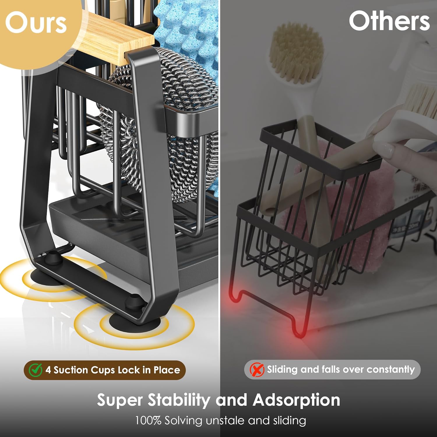 - 【Shake-Proof Stability】Stays put through chaos,four industrial-strength rubber suction cups grip like a gecko, ensuring shake-proof stability on marble, granite, or glass-no slips, no falls, even when scrubbing fiercely or kids crash into the kitchen countertop!