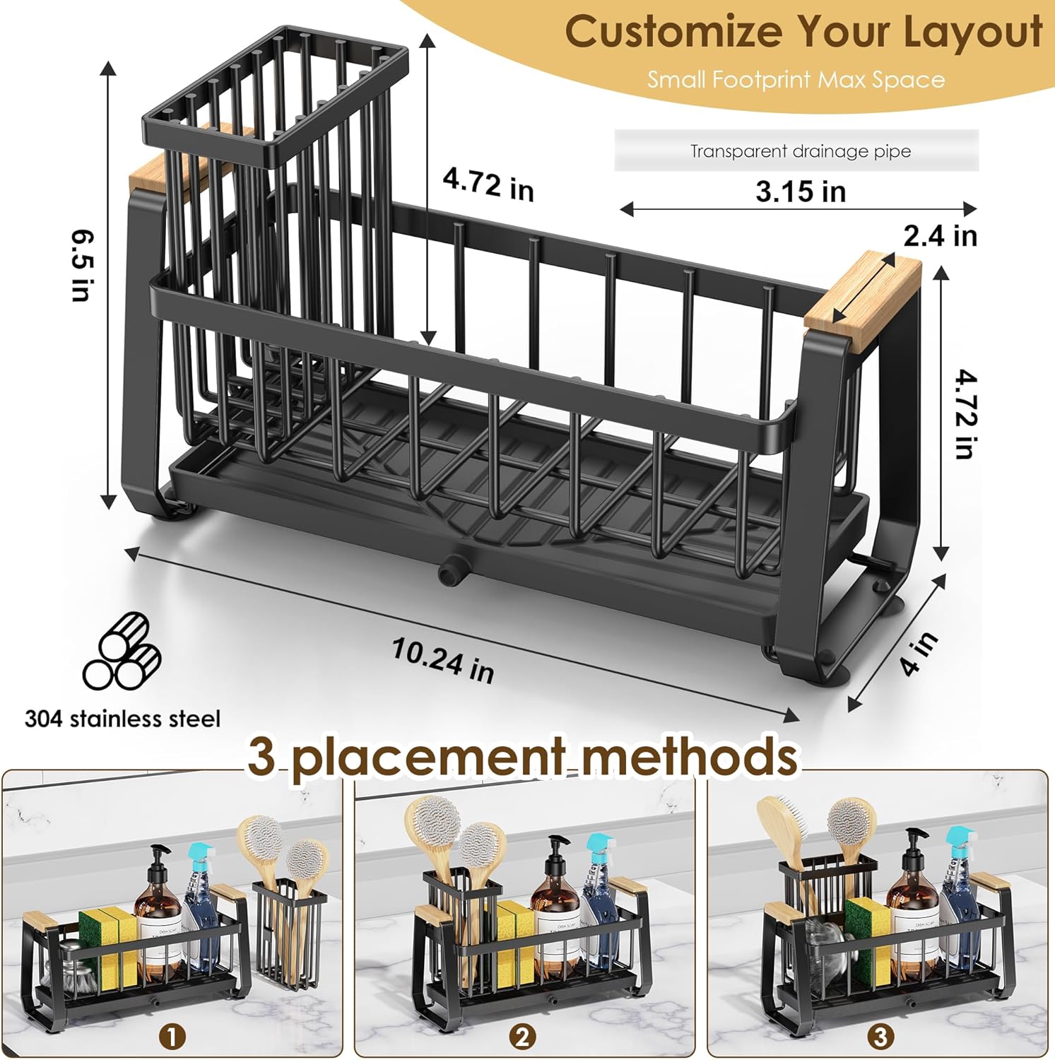 - 【Small Footprint Max Space】Our kitchen countertop organizer has upgraded the height of the brush rack storage part and adopts a unique engineering design. It measures only 10.24"*4"*6.88",the same size can hold 30% more capacity than standard brush holder, and flexible storage for dish soap, brushes, sponges.