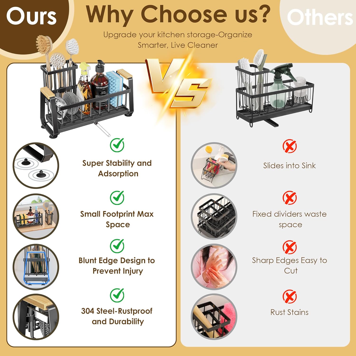 - 【304 Stainless Steel】Doasuwish kitchen sink organizer is made of 304 stainless steel.Rustproof and stays like new-Lab tested to resist rust, stains, and fingerprints. Unlike other sink caddy that corrode and stain your countertops, our kitchen sink caddy stays pristine even in humid kitchens. Just rinse & go-no maintenance!