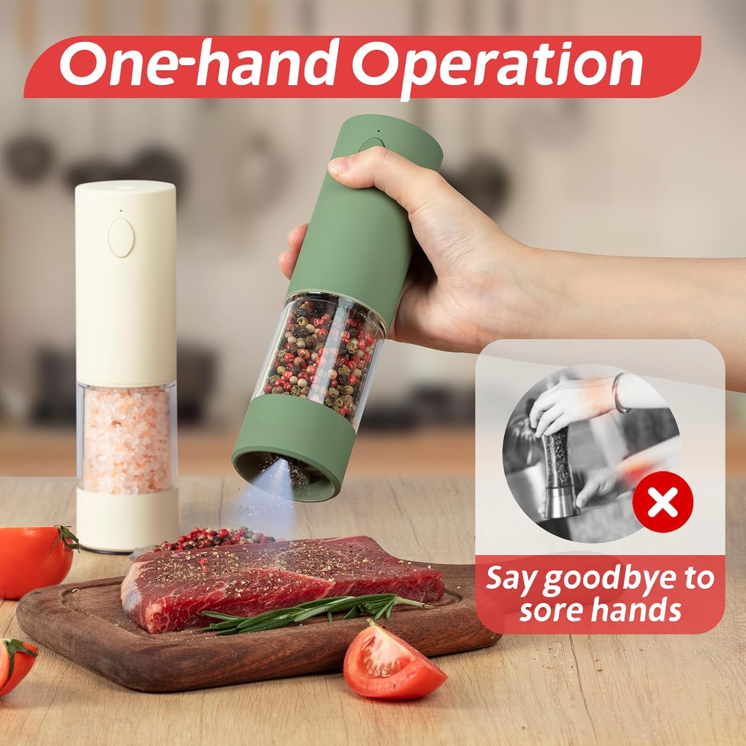 - Effortless One-Hand Operation & Arthritis-Friendly Design - Designed for busy kitchens and sensitive hands! Simply press the top button with one hand to grind spices effortlessly—no twisting or gripping required. Perfect for seniors, arthritis sufferers, or multitasking cooks. The USB-C rechargeable system eliminates disposable batteries (fully charges in 2 hours!), saving costs and reducing waste