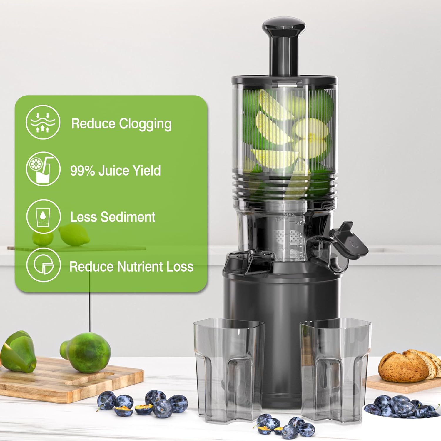 - Hands-Free Juicing: The self-feeding hopper lets you load your entire recipe at once, freeing you to multitask in the kitchen. This juicing machine for fruits and vegetables ensures convenience and efficiency. Forget tedious pre-chopping