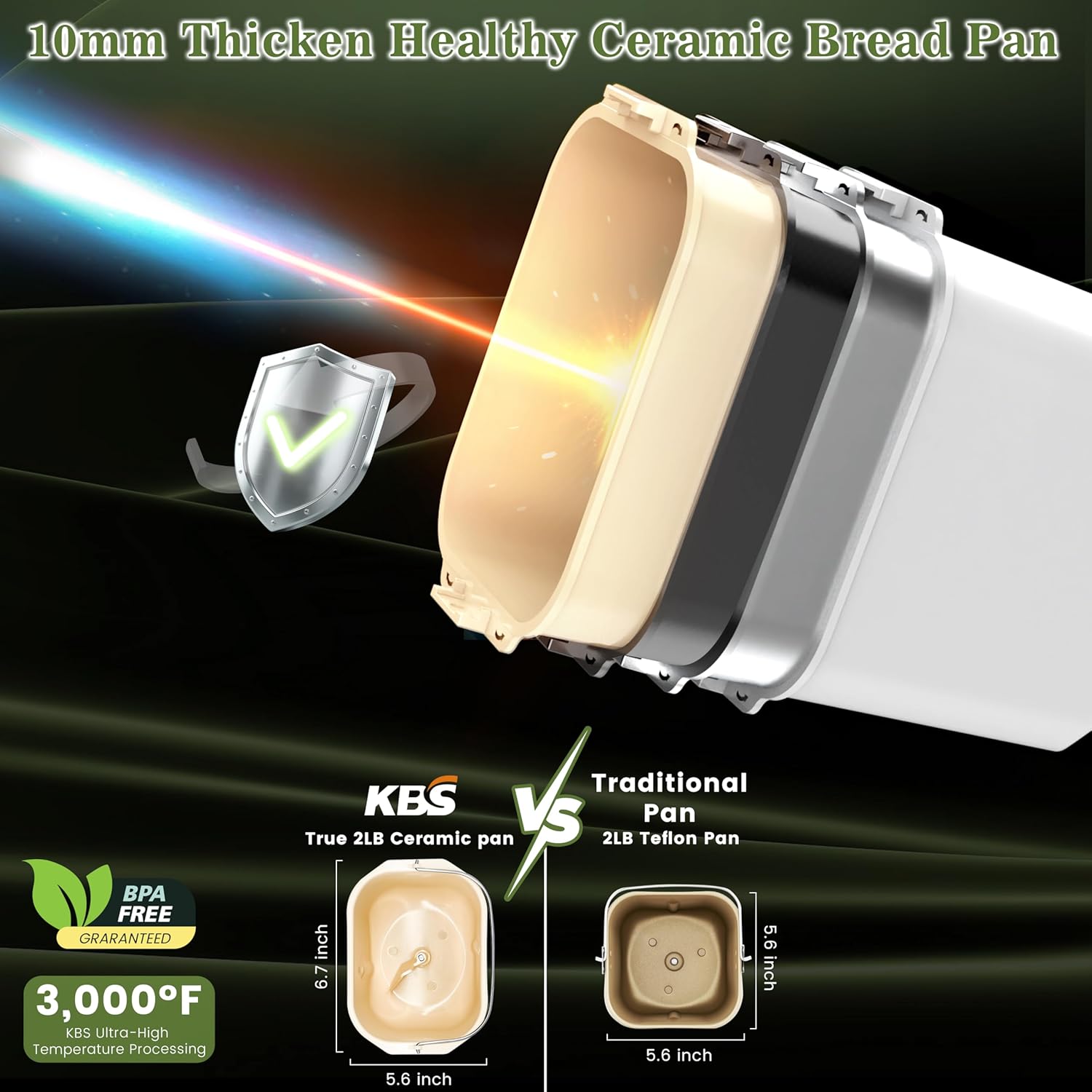 - 5 LAYER REVOLUTIONARY 2.2LB CERAMIC BREAD PAN:KBS ceramic bread maker adopts 3000°F high temperature plasma sintering process, no PTFE/PFOA/lead, is the safest nano-level smooth ceramic pan, adopts rounded corners without any dead angle design, has super thermal conductivity, and can achieve baking uniformity of ±2°F. KBS non-stick 0.5mm precision die-cast bread pan breaks through 5 layers of ceramic and metal structure, is impact-resistant and corrosion-resistant, and meets maternal and child-grade use standards.KBS provides lifetime support