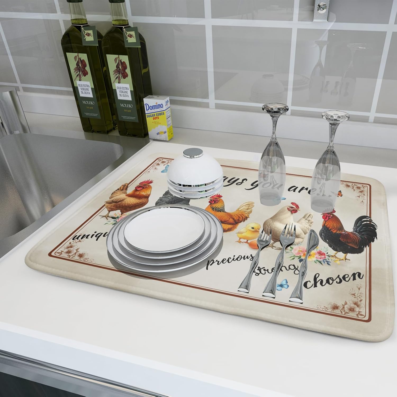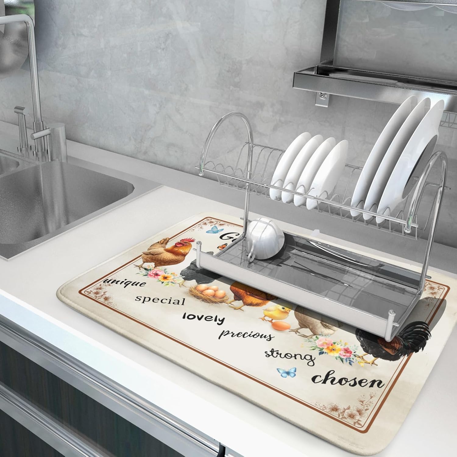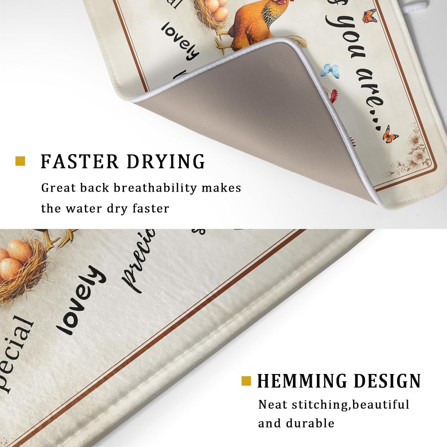 - Size: The rooster drying mat measure 18 x 24 inch (45.7 x 60.9 cm) for you. Fit most countertop space. Different design on 2 sides, one side can suck moisture with chicken pattern, another one gray non-slip side
