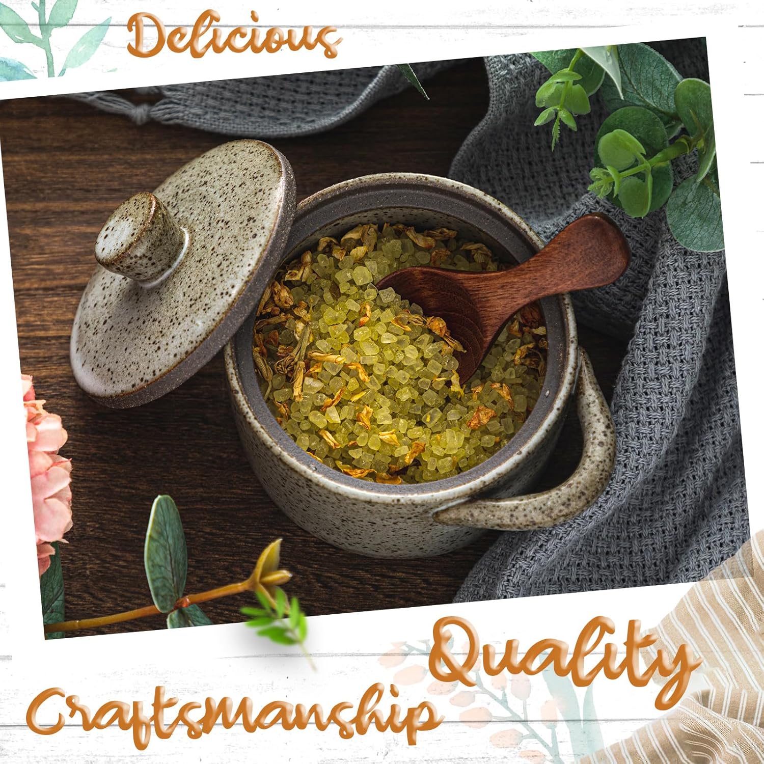 - Reliable Materials: salt bowl with lid is crafted from ceramic, complemented by a sturdy wooden lid, this durable piece promises longevity; Its robust build ensures resistance to daily wear and tear, making it a reliable choice for your spice storage needs