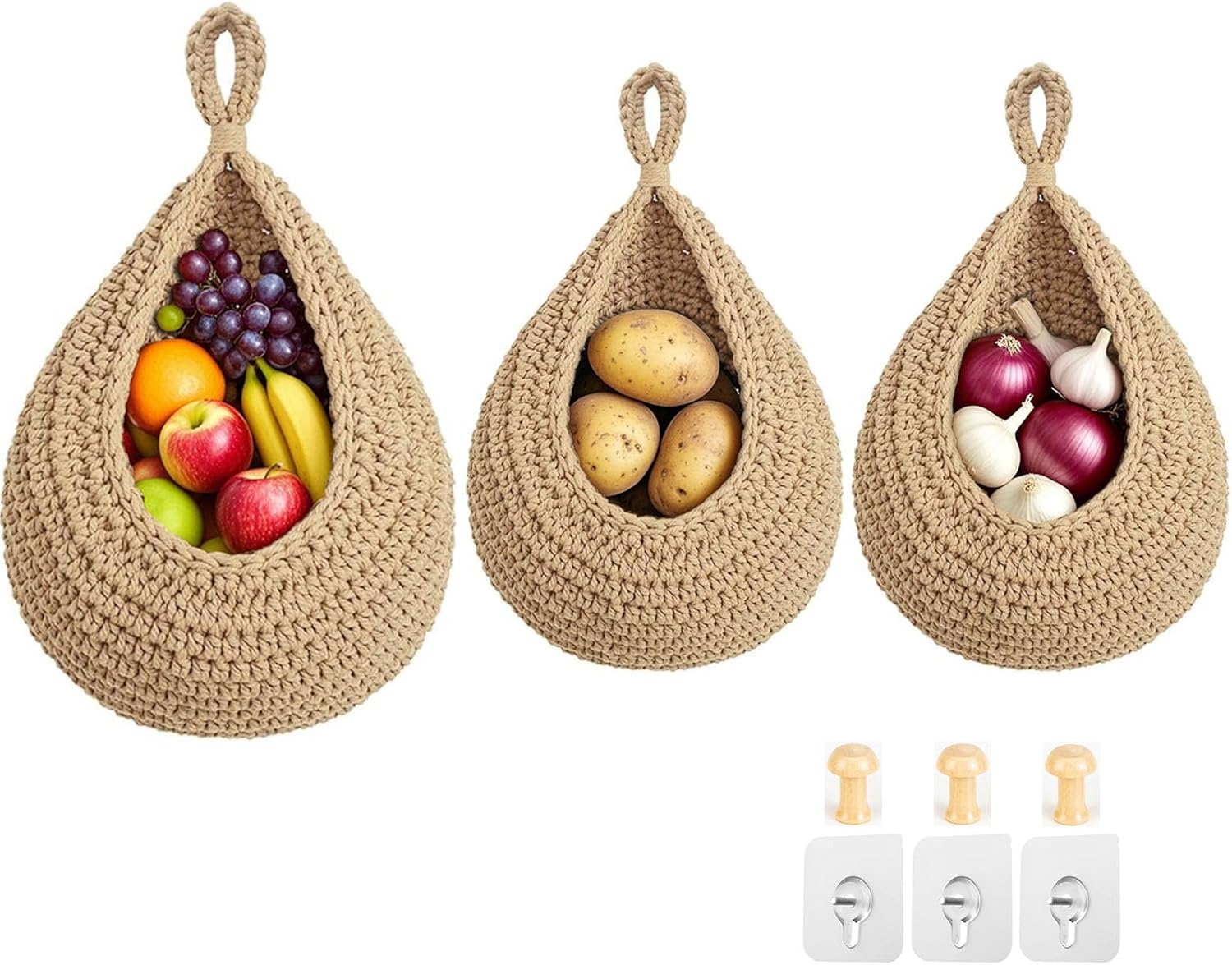 - Easy Installation: The product provides 3 pcs strong No-Punch screw stickers and 3 pcs Bohemian-style wooden hooks for free. With two installation methods, it provides you with more usage scenarios and also makes the fruit basket look more beautiful and practical