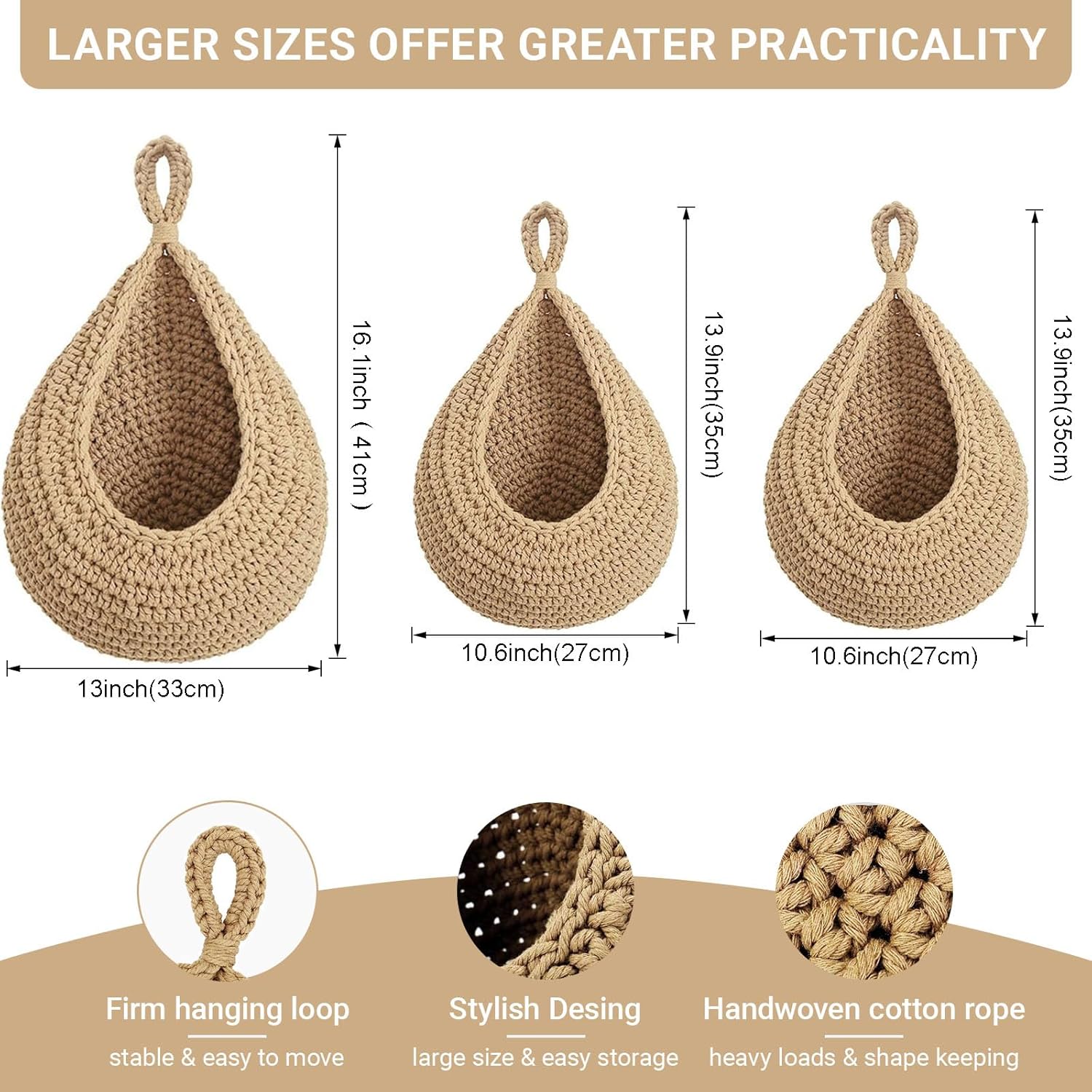- Product Overview: This set includes 3 pack cotton rope handwoven hanging baskets,one in the largest size (16.1"L*13"W) and two in the medium-large size(13.9"L*10.6"W), enabling you to store more items