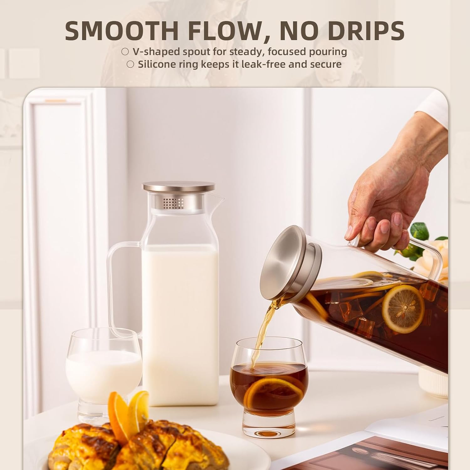 - Borosilicate glass: It is made of food-grade borosilicate glass, which is lead-free and durable. Ergonomically designed handle makes it easy to hold and pour.