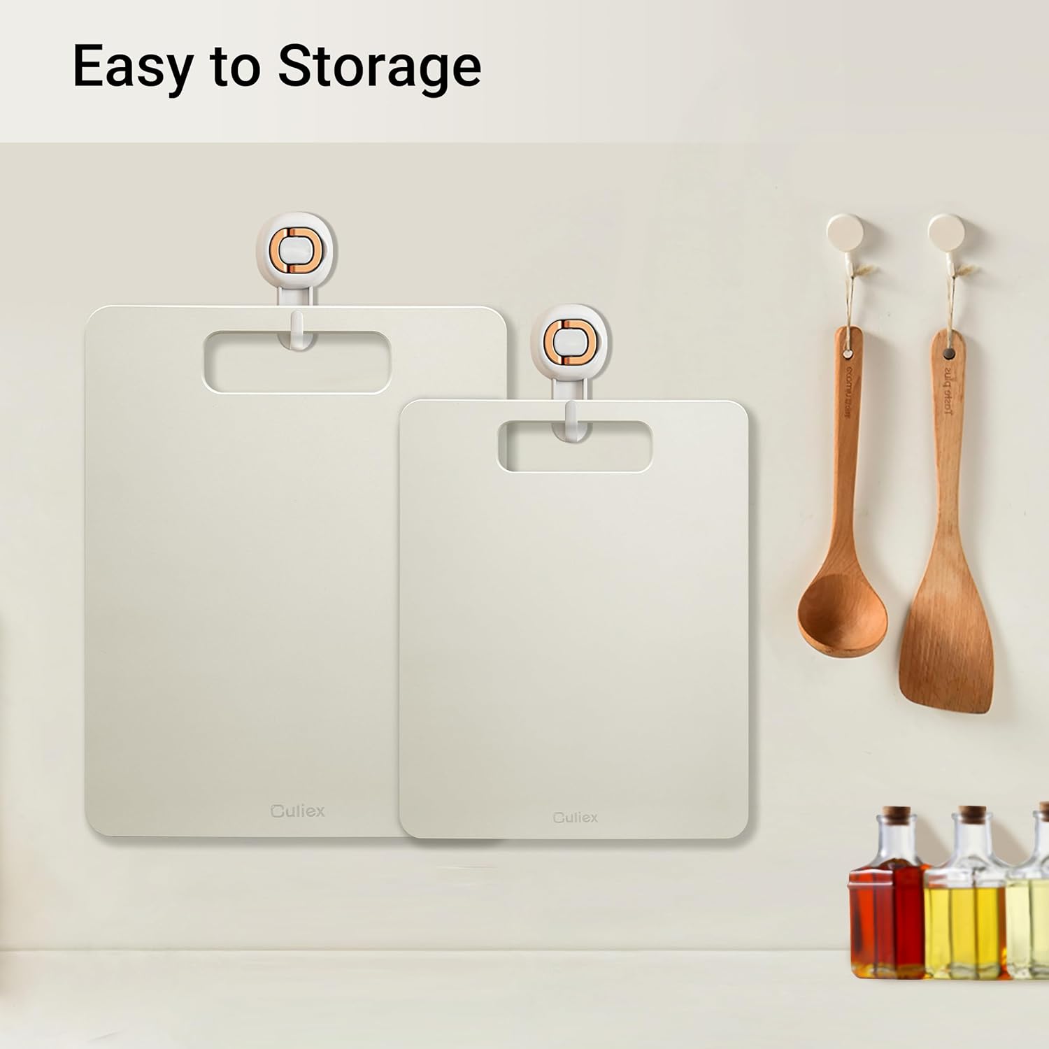 - Convenient Hanging Hole: The built-in handles make these chopping boards is easy to hang, providing an organized kitchen space. When using the chopping board as a tray, the hole can be used as a finger grip, making it simple to transfer ingredients from your kitchen to the stove, without worrying about having fingers & dropping your food.