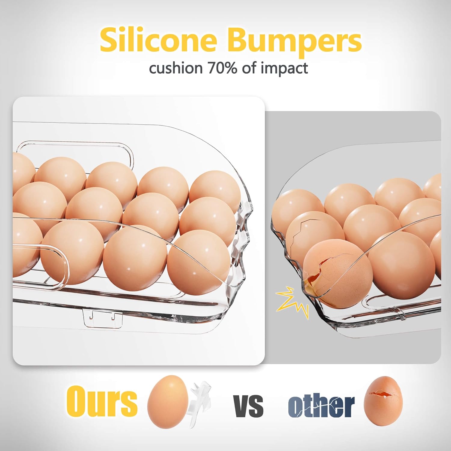 Egg Holder for Fridge, Automatic Steady Rolling Egg Container with Soft Bumpers & Handle for Refrigerator, Stackable Fridge Organizers and Storage with Lid