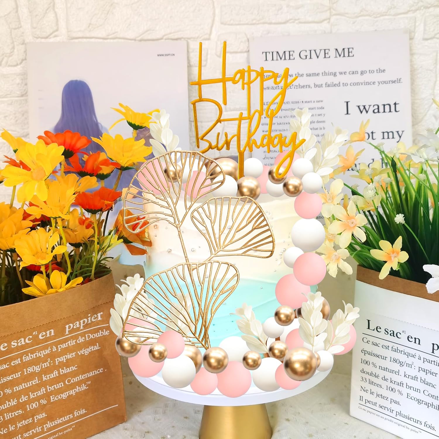 Gyufise 57Pcs Balls Cake Topper Boho Grass Cake topper Pearl Balls Acrylic Happy Birthday Cake Decorations for Wedding Baby Shower Birthday Boho Themed Party Supplies Pink