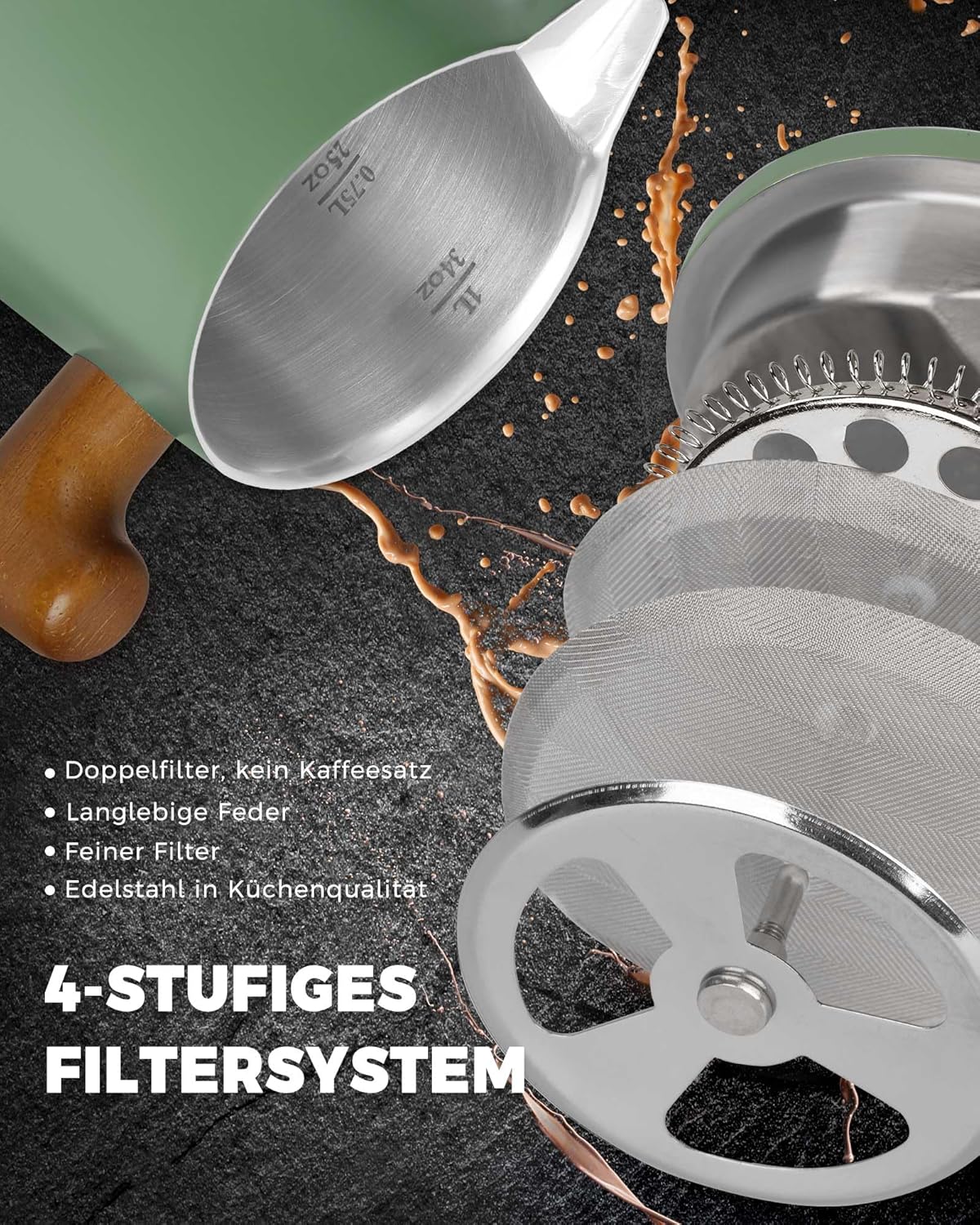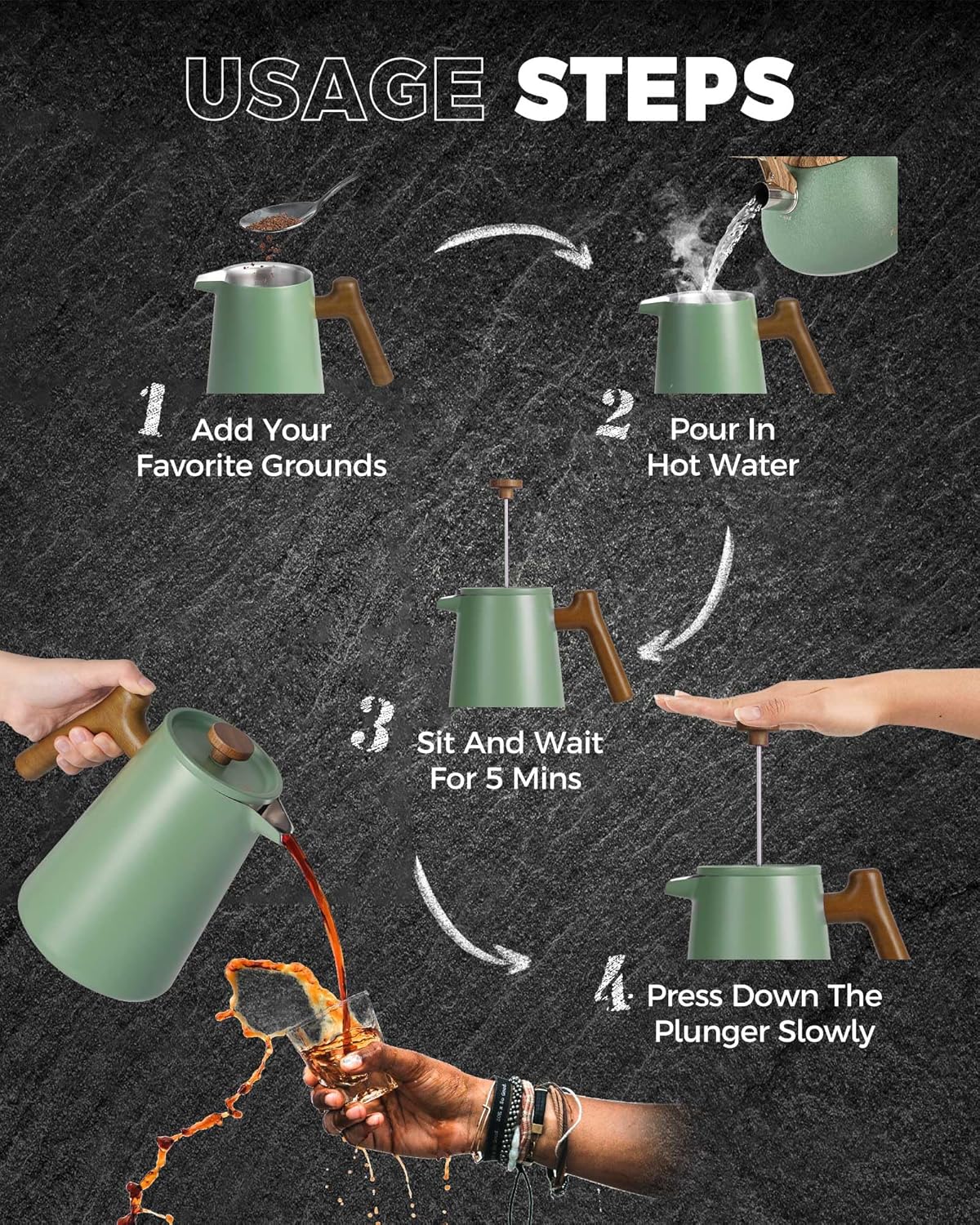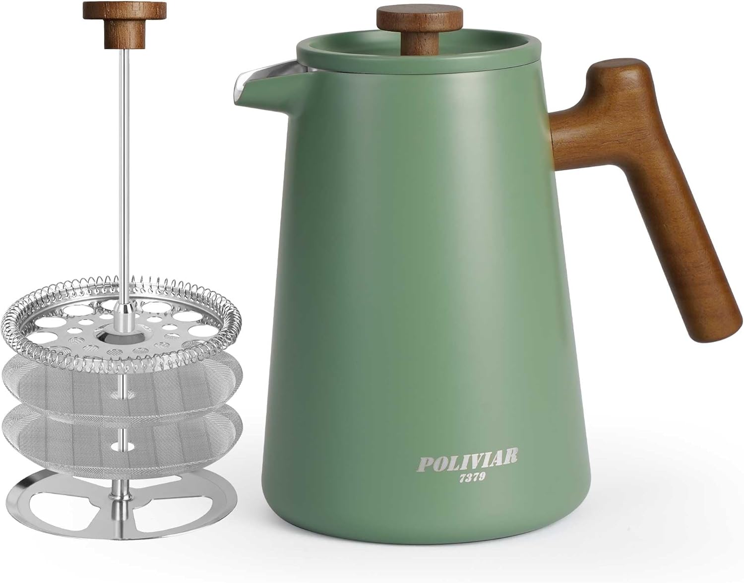 - LOOKING FOR COFFEE PRESS FOR MATCHING UP YOUR KITCHEN? We, the POLIVIAR french press coffee maker will be your smart choice. While the coffee pot is made from food grade stainless steel with stylish long-lasting coating, It is easily to match up your kitchenwares and your kitchen's theme. Also, the ergonomic handle with real wood will maximize the fantastic time of grounds you loved.