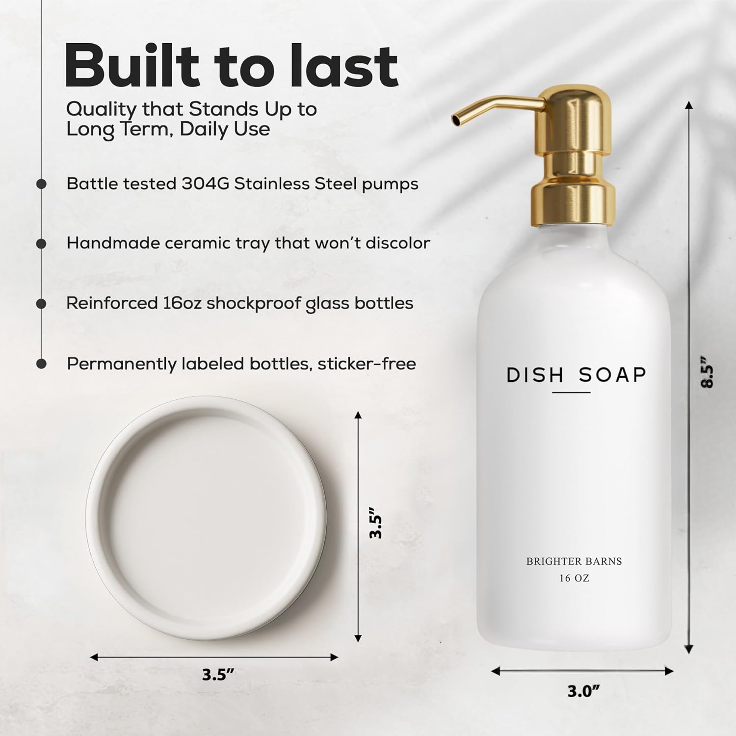 - AMERICAN DESIGN, UNCOMPROMISING QUALITY - Crafted with meticulous attention to detail, our aesthetic glass soap dispenser with pump set features a robust 16oz glass bottle, corrosion-proof 304G stainless steel pump, and a stain-resistant ceramic tray. All designed in the USA to provide unbeatable quality and enduring style that you can trust.