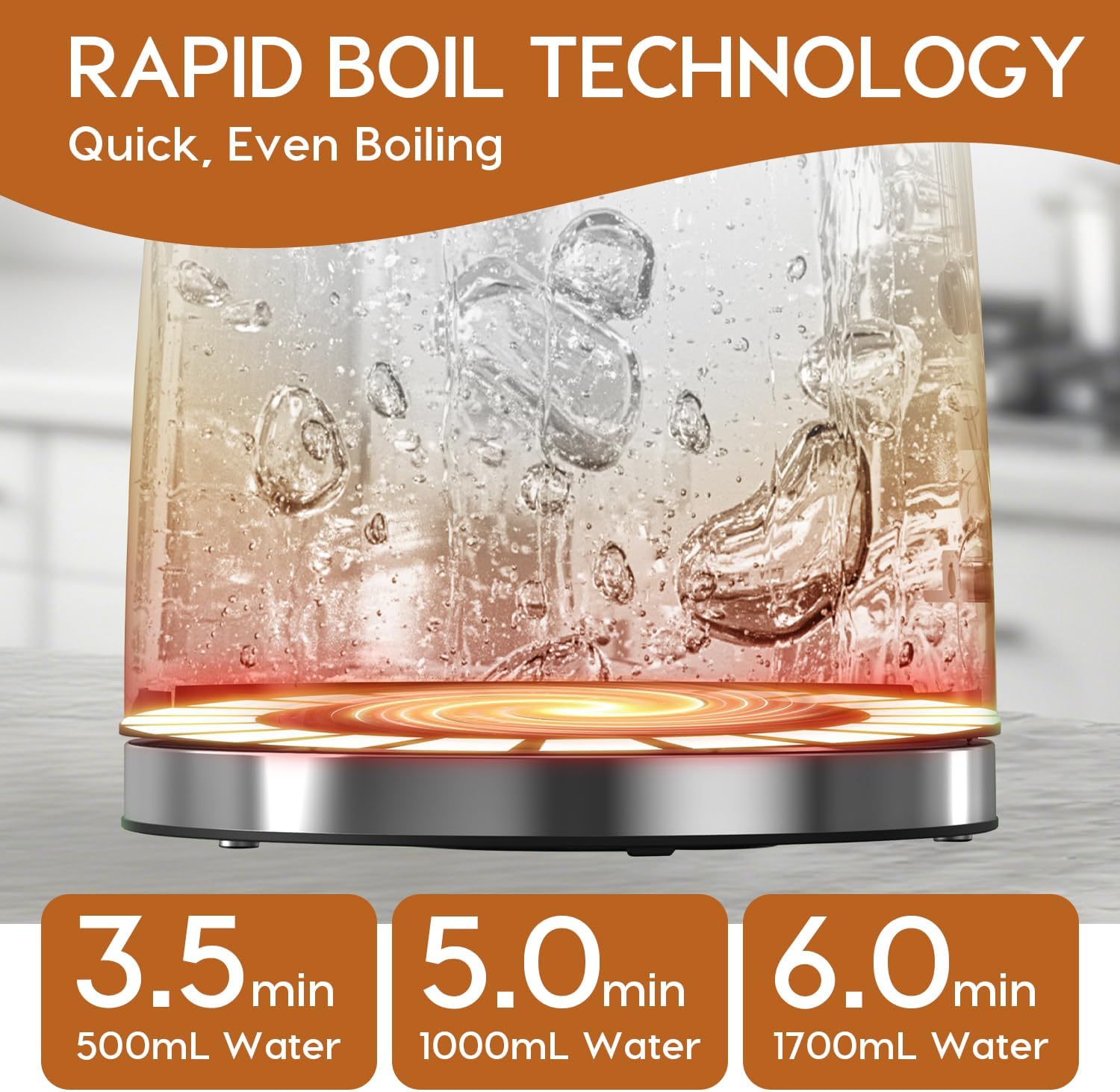 - 🫖RAPID BOILING & LARGE CAPACITY || 1500W electric kettle speedily boils 1.7L of water in under 6mins, saving you time for brewing tea, coffee and more in busy mornings; unrivaled 1.7L large capacity – 6 cups, 250ml per cup – is perfect for serving your family or guests.