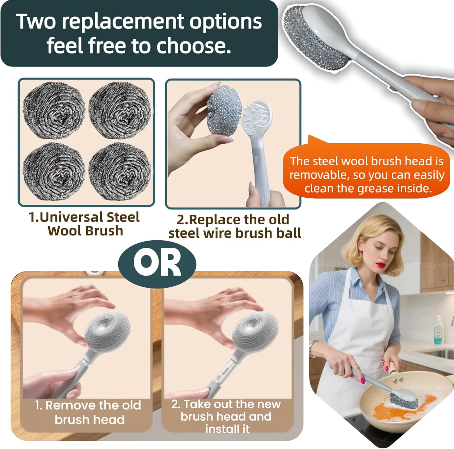 - All-in-one kitchen Dish Brush Set:Feature a replaceable heads,includes dish brush with handle of 3 pieces - steel wool, sponge and plant fiber brush - plus acompact holder. Perfect for everyday cleaning