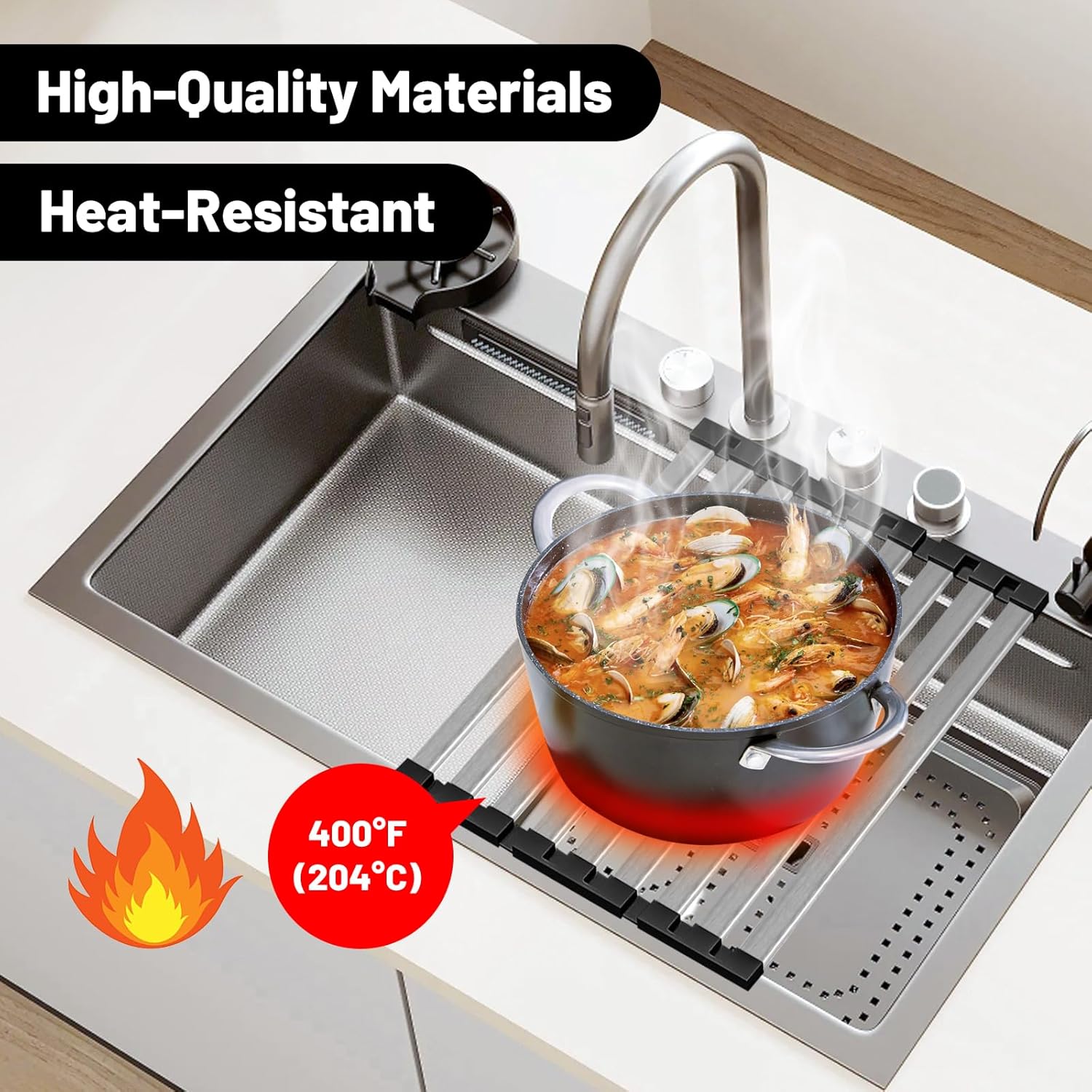 - 304 Stainless Steel and Food-Grade Silicone: The dish-draining rack with food-grade silicone coating is heat-resistant up to 400°F (204°C) and dishwasher safe. For cooling down hot pans from the oven or stovetop, or thawing frozen items from the refrigerator.
