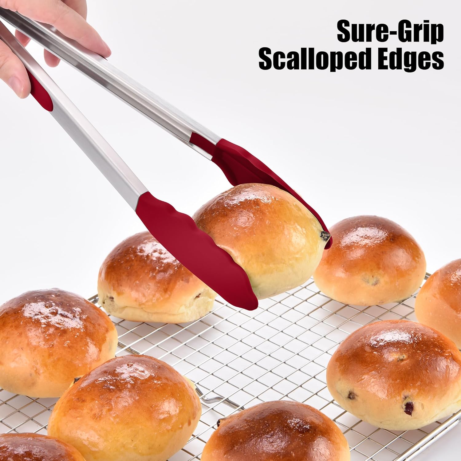 Doosu Kitchen Tongs for Cooking - 600°F Heat Resistant Food Tong Set with Non-Scratch Silicone Tips, Heavy Duty Stainless Steel Locking Tong for BBQ, Grilling Steak, Serving Salad (7+9+12in, Red)