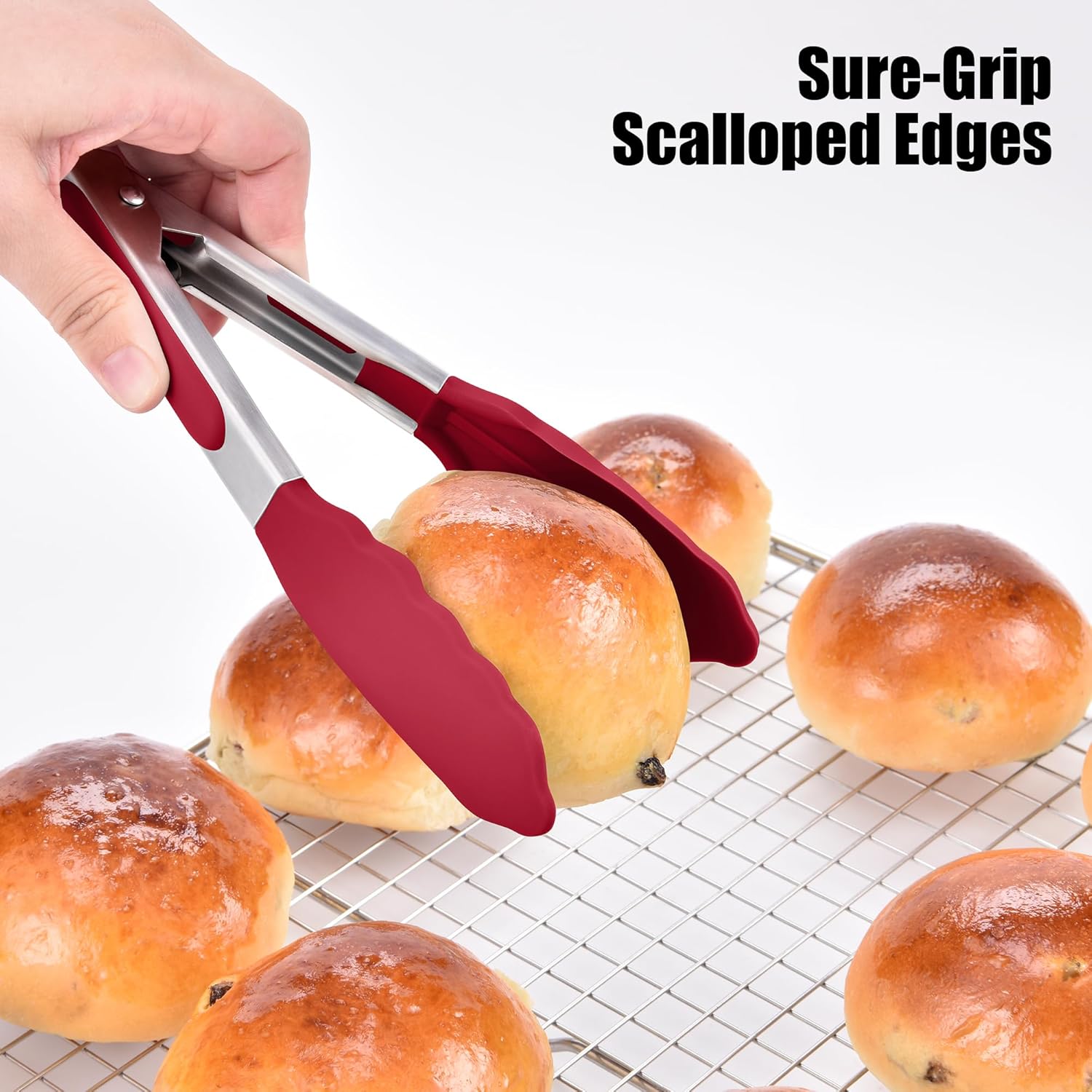 Doosu Kitchen Tongs for Cooking - 600°F Heat Resistant Food Tong with Non-Scratch Silicone Tips, Heavy Duty Stainless Steel Locking Tong for BBQ, Grilling Steak, Serving Salad, Pasta (7in, Red)
