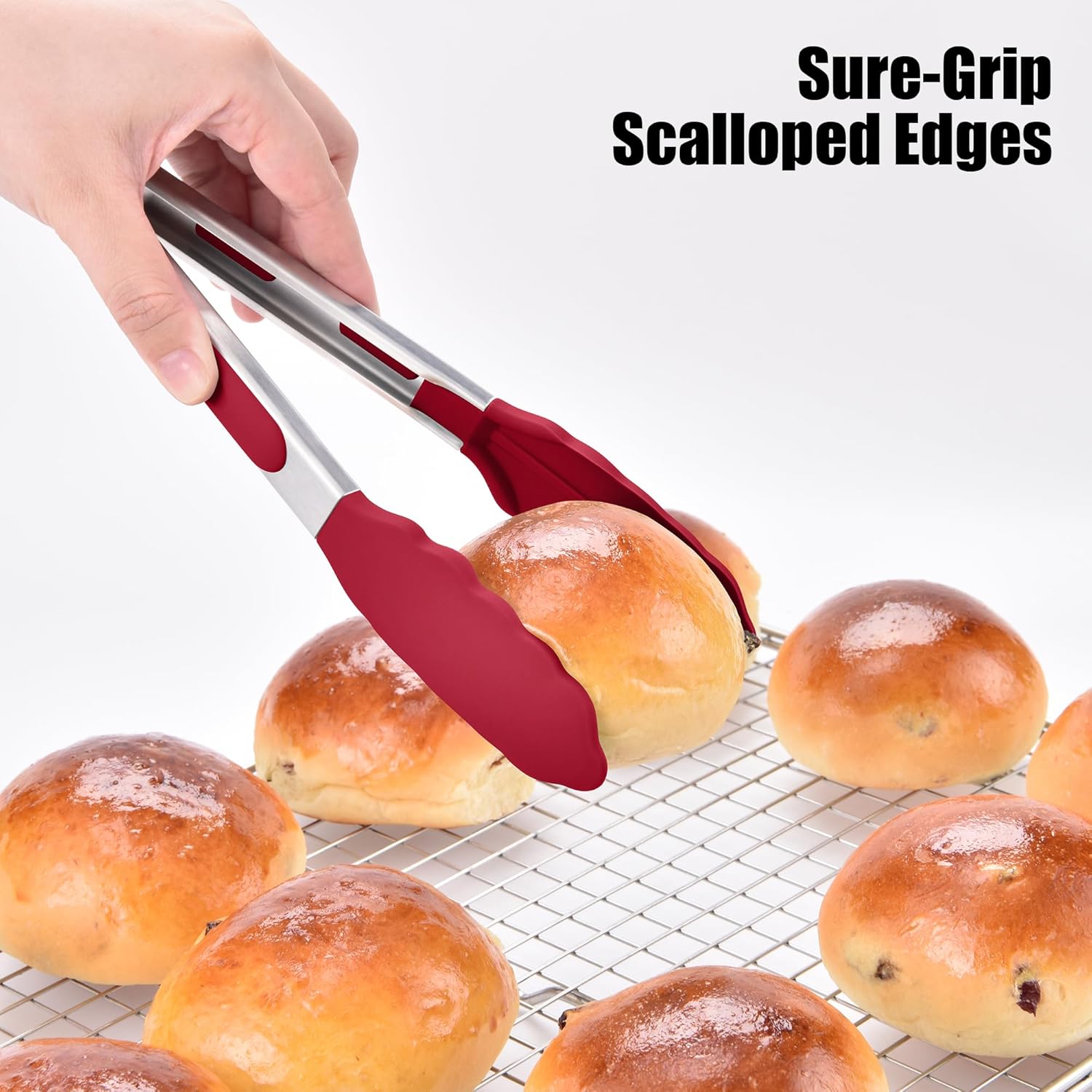 - Are tips heat-resistant and non-scratch? The tips of the tong are coated with high-quality, food grade silicone that is heat-resistant up to 600°F (315°C), making them safe for directly handling hot foods from the oven, stovetop, or grill. Unlike metal-tipped tongs, the soft silicone tip won’t scratch or damage non-stick pans or grill grates. The scalloped edges are specially designed to provide a secure, non-slip grip, easy to grasp delicate vegetables, smooth meat, or small pieces of food.