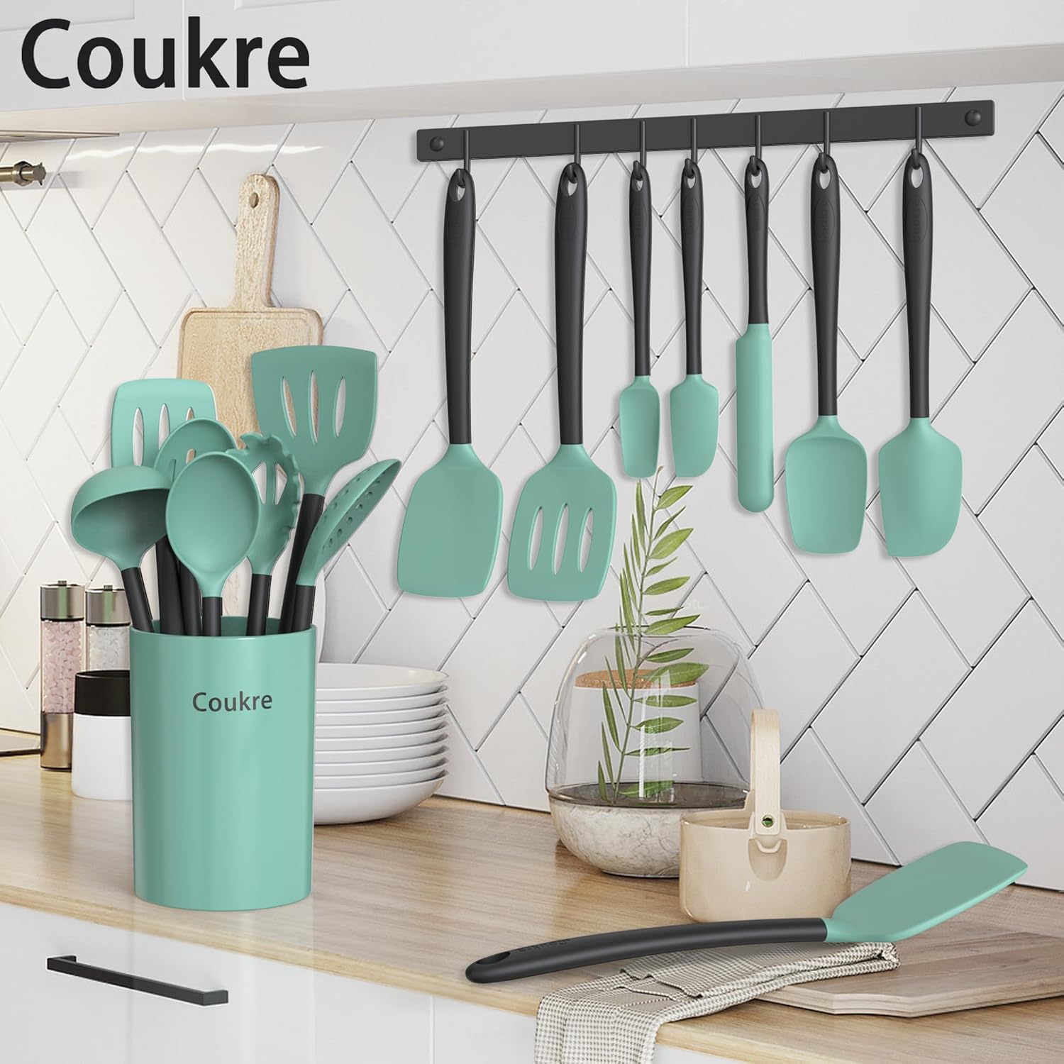 Coukre Silicone Kitchen Cooking Utensils Set with Holder – Heat-Resistant, Food-Grade Kitchen Tools, Spatula, Spoon & Gadgets for Non-Stick Pans, Dishwasher Safe (14, AquaGreen)