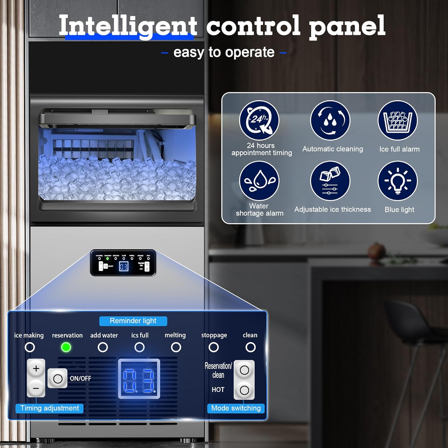 - Intelligent Control Panel: Our commercial ice machine is equipped with LED digital display and mechanical buttons for operation, adjusting the thickness of ice, 24-hour appointment timing, self-cleaning, built-in blue light, prompt lights (ice full stop, water shortage prompt, etc.), so that you can accurately control the process of ice.