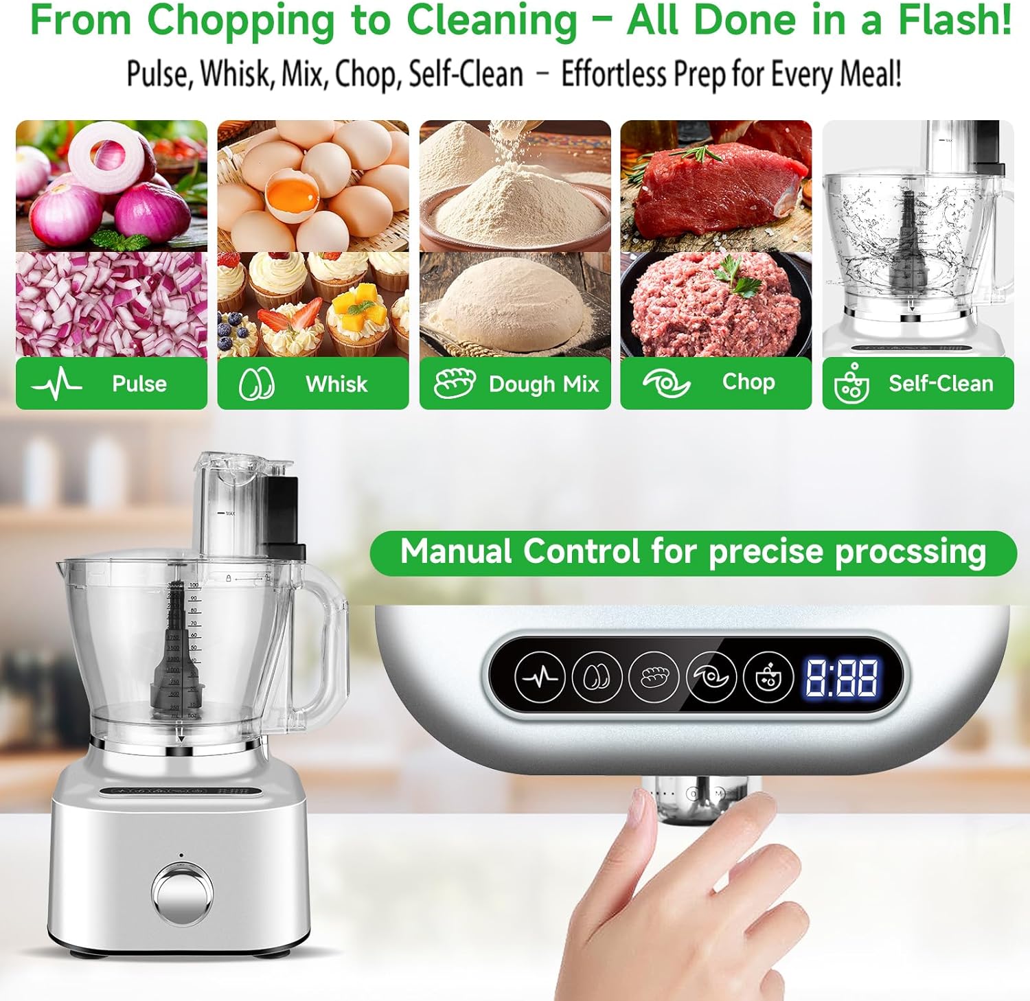 - 【Smart 5 Preset Modes + Stepless Speed Control for Perfect Results】Easy-to-use controls let you choose between 5 preset functions (Pulse, Whisk, Dough Mixing, Chop, and Auto Clean) or manually adjust speed for precision: Start at "0" – Wait for the screen light to flash. Turn the knob to "M" – Tap the screen to select a preset mode.Manual Speed Adjustment – From "0," rotate the knob counterclockwise for smooth, stepless speed control, perfect for delicate tasks like whipping cream or heavy-duty jobs like kneading thick dough.
