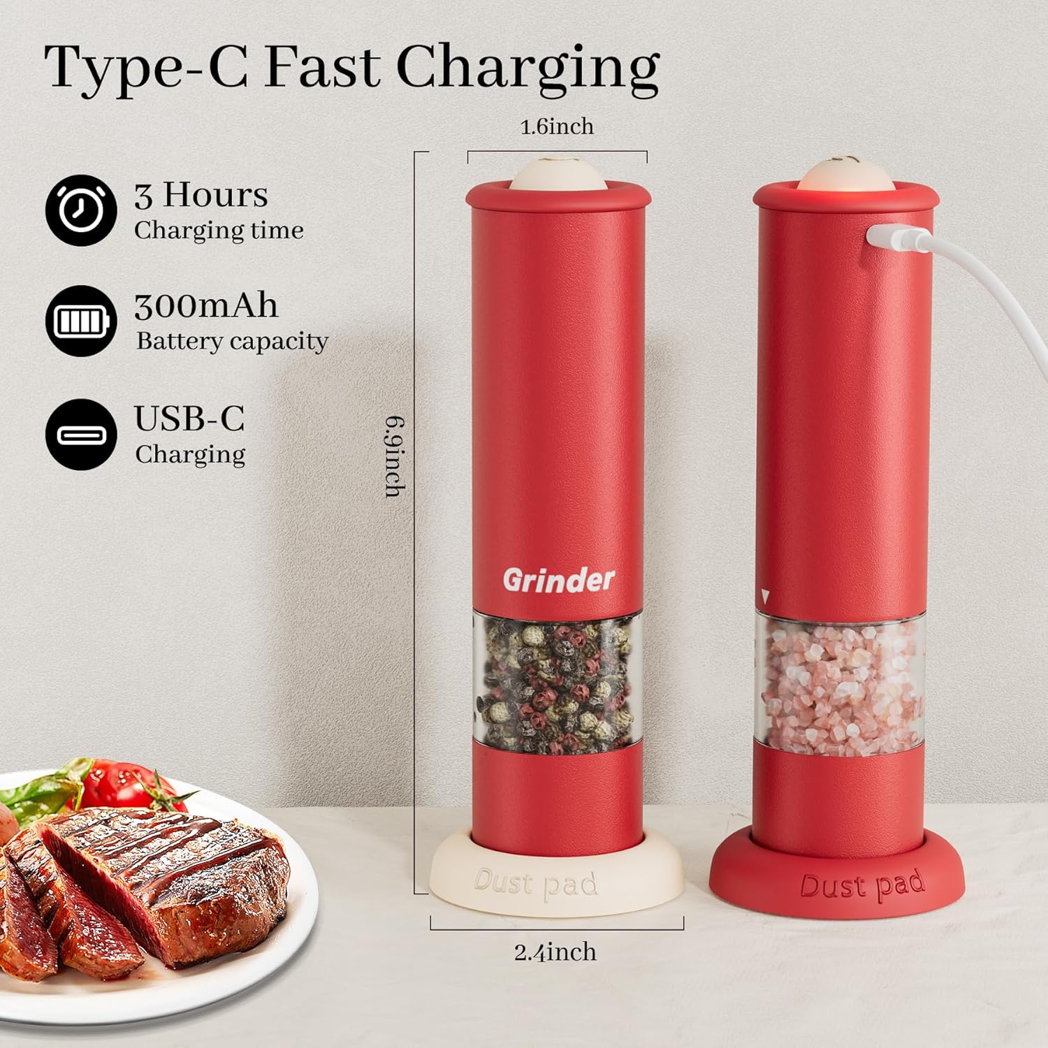 - Rechargeable and Sustainable: Our DGINGEFATY rechargeable salt and pepper grinder set (also electric salt and pepper grinder set rechargeable/salt and pepper grinder set rechargeable) includes a Type-C cable for quick charging. This rechargeable salt and pepper grinder works for ~1 month per charge, cutting disposable battery costs and supporting a greener lifestyle.