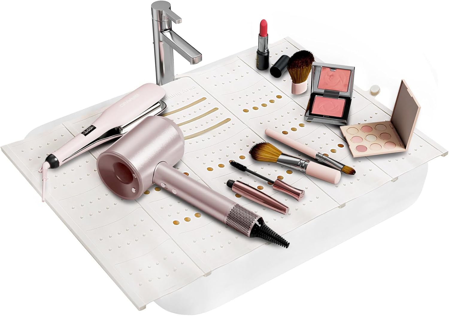Bathroom Sink Cover for Counter Space, Sink Mat Foldable Sink Cover, Silicone Makeup Organizer Mat Space Saver, Small Bathroom & Rv Camper Travel Must Haves Accessories - Large, Pearl