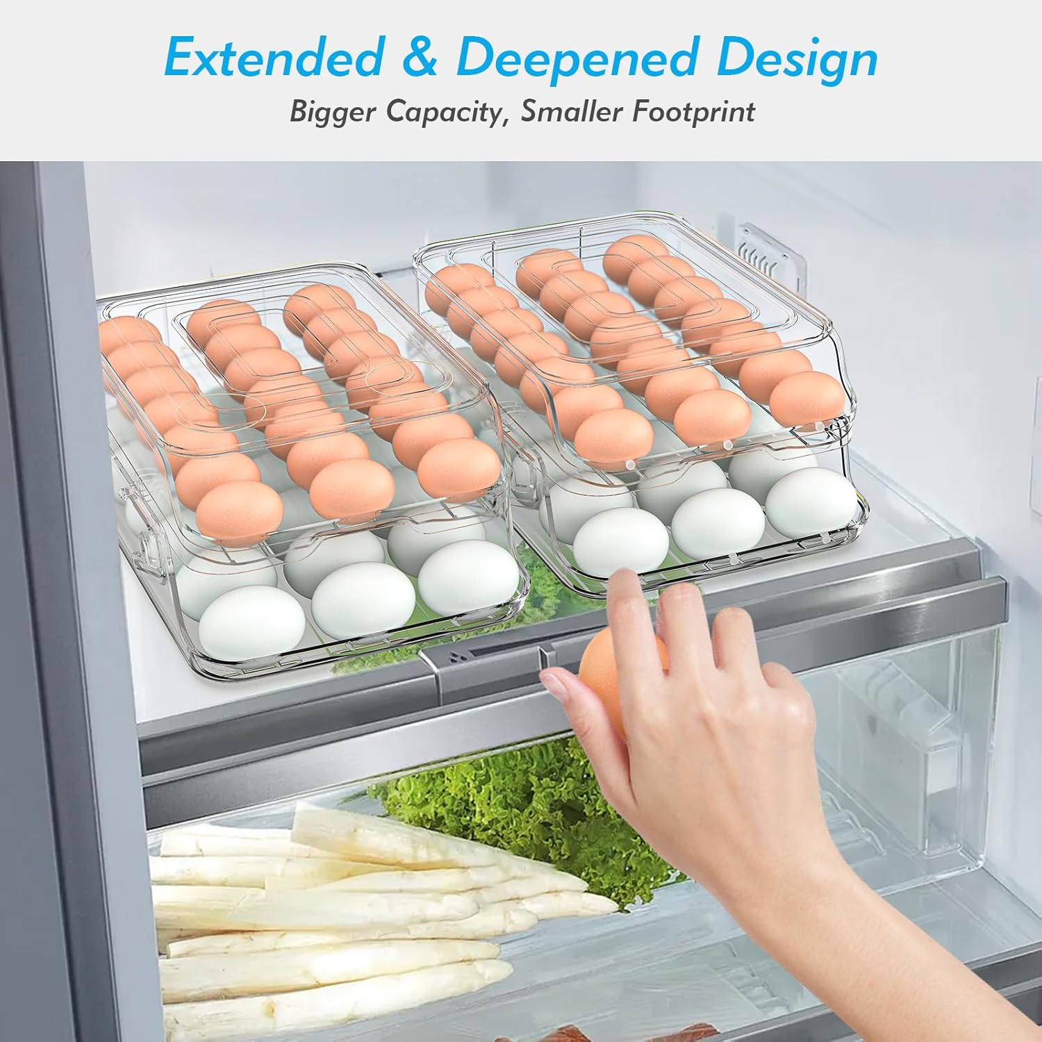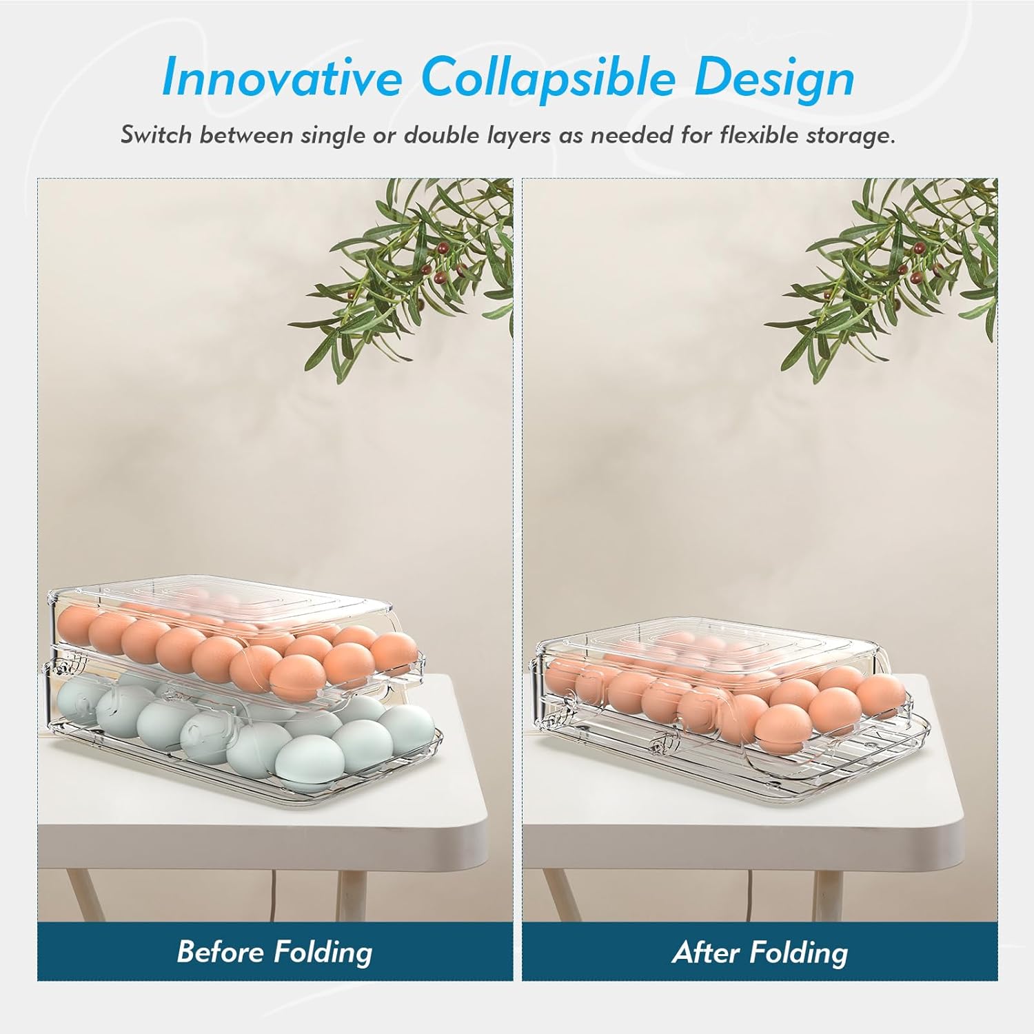 - 🥚 [Foldable 2-Tier Egg Holder — Holds Up to 42 Eggs] This upgraded egg holder features a foldable double-layer design. Each layer stores 21 eggs, totaling up to 42 eggs without taking extra fridge space. A must-have for large families and anyone needing efficient egg storage for refrigerator.