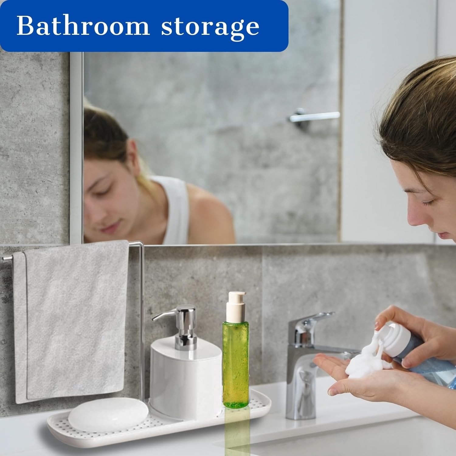 - Space saving】 The sponge holder for kitchen sink ergonomic divider design allows it to have 3 separate storage spaces, Different items are placed in different areas. Make the most of every inch of space and make your kitchen look cleaner which can perfecthul save countertop space and upgraded brush rack that can hola up to 4 samall and large kitchen tools Keep your counters clean and organized with this functional soap dispenser set. Featuring a durable pump and a stable base, this set is designed for everyday use in high-traffic areas like the kitchen and bathroom.