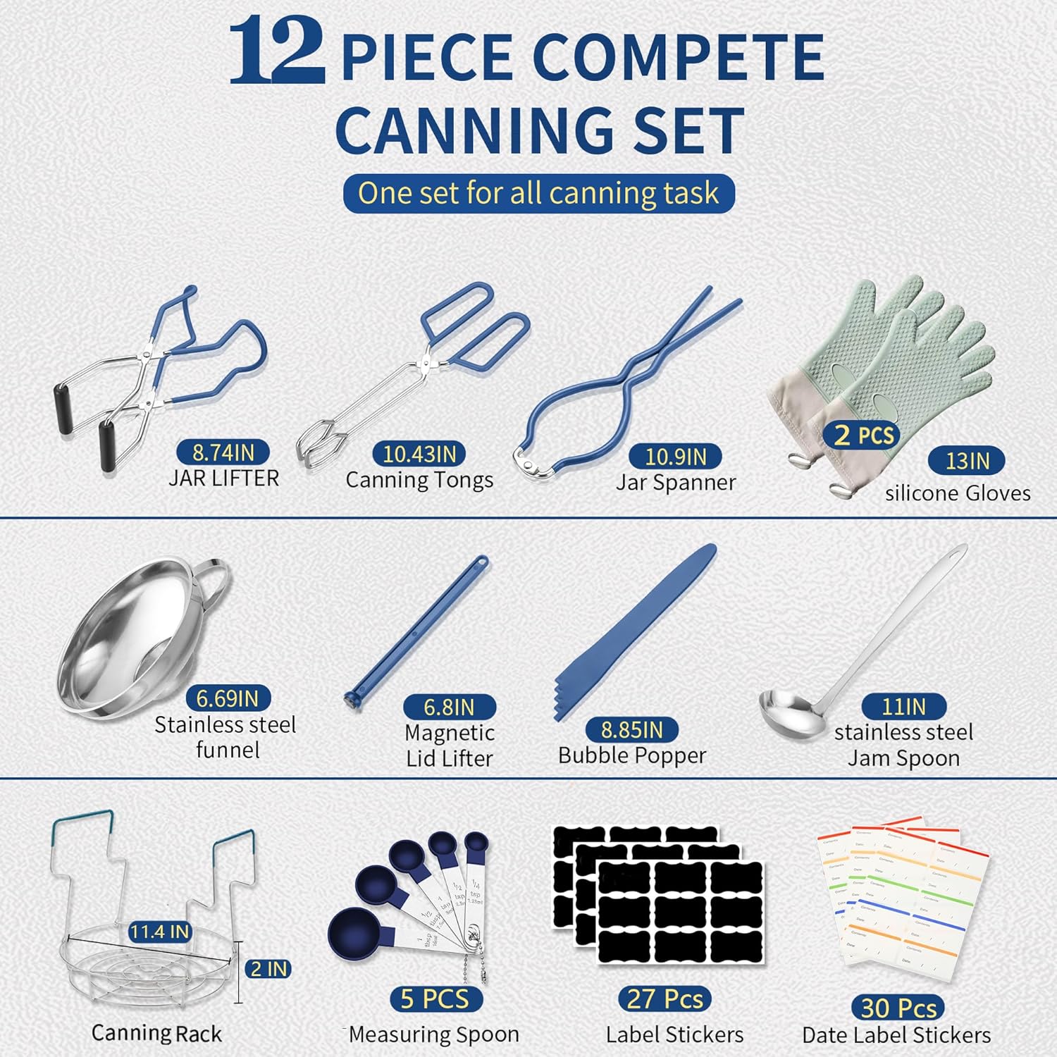 Canning Supplies Starter Kit,Canning Kit for Beginners of 12 with Rack,Silicone Oven Gloves,Jar Lifter,Funnel,Wrench,Tongs,Lid Lifter,Bubble Popper,Labels,ladle,Measuring spoon-G12-Blue