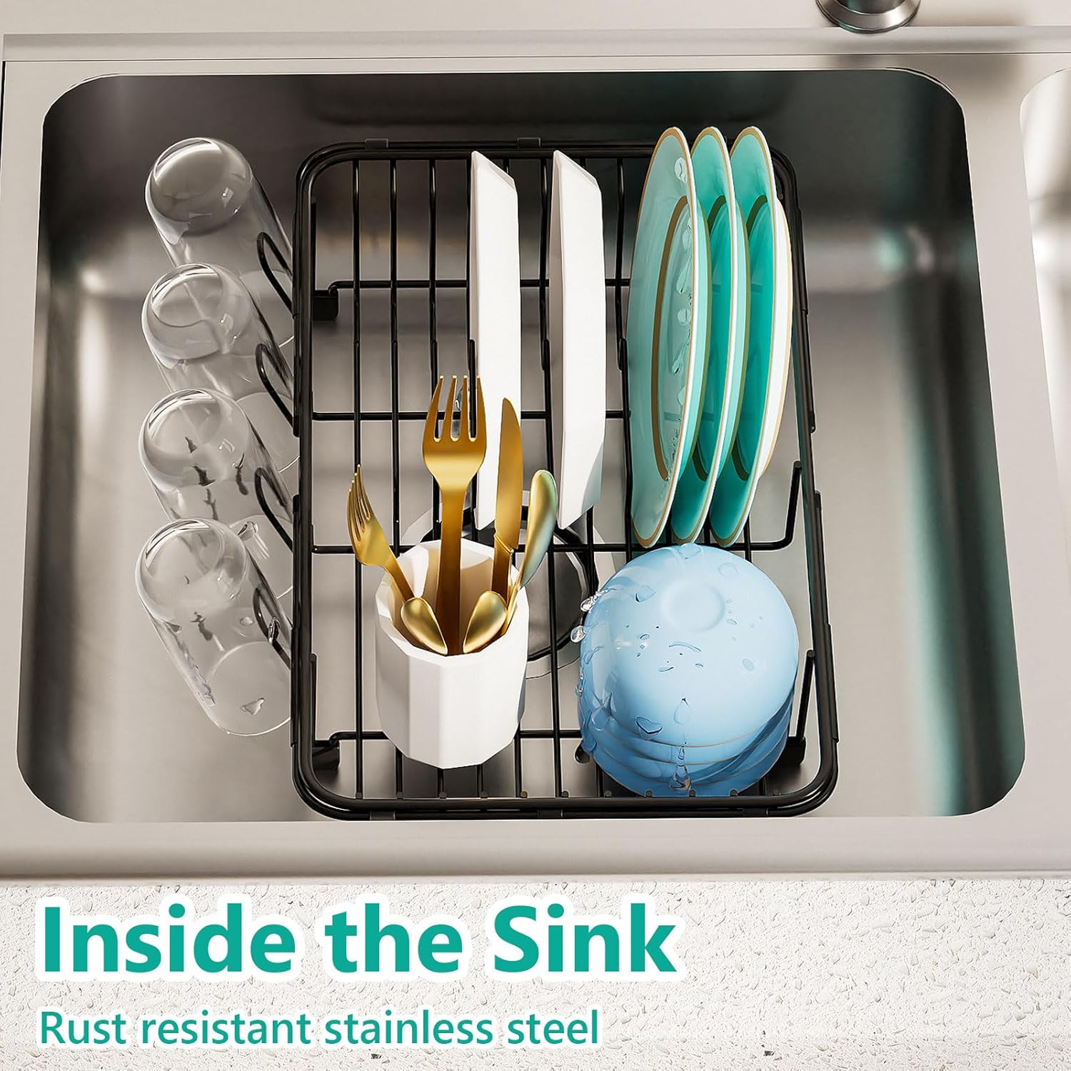 Dish Drying Rack in Sink Expandable Stainless Steel Kitchen Dish Drainer with 4 Cup Holders, Black