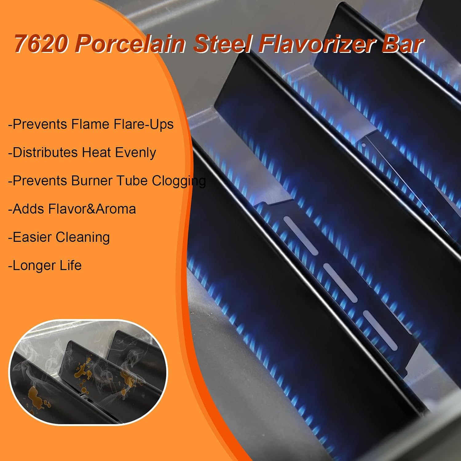 - Durable Porcelain Steel Flavorizer Bar&Heat Deflector:The thicker snowflake porcelain steel flavorizer bar has a high-temperature resistant coating, a smooth surface, non stick oil, and easy to clean.They can evenly dissipate heat and add a smoky flavor to the food.The flavor bar effectively keeps oil and droplets away from the burner tube, reducing flame splashing and preventing burner tube blockage.Heat Deflector can prevent food directly expose to the flame