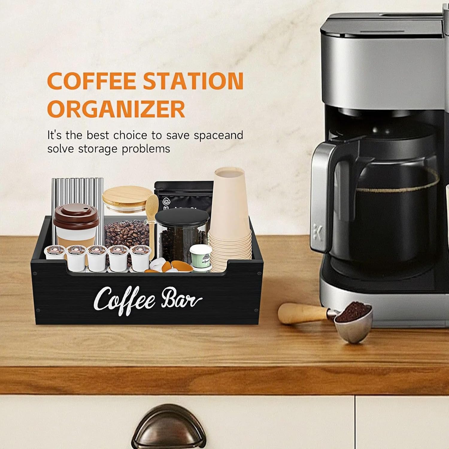 - 1, 【Spacious Storage Space】 This 13" x 7" x 4" wooden organizer offers a generous open space to neatly store coffee pods, sachets, mugs, canisters, syrups, and daily accessories. Its compact size keeps your countertop tidy coffee routine effortless