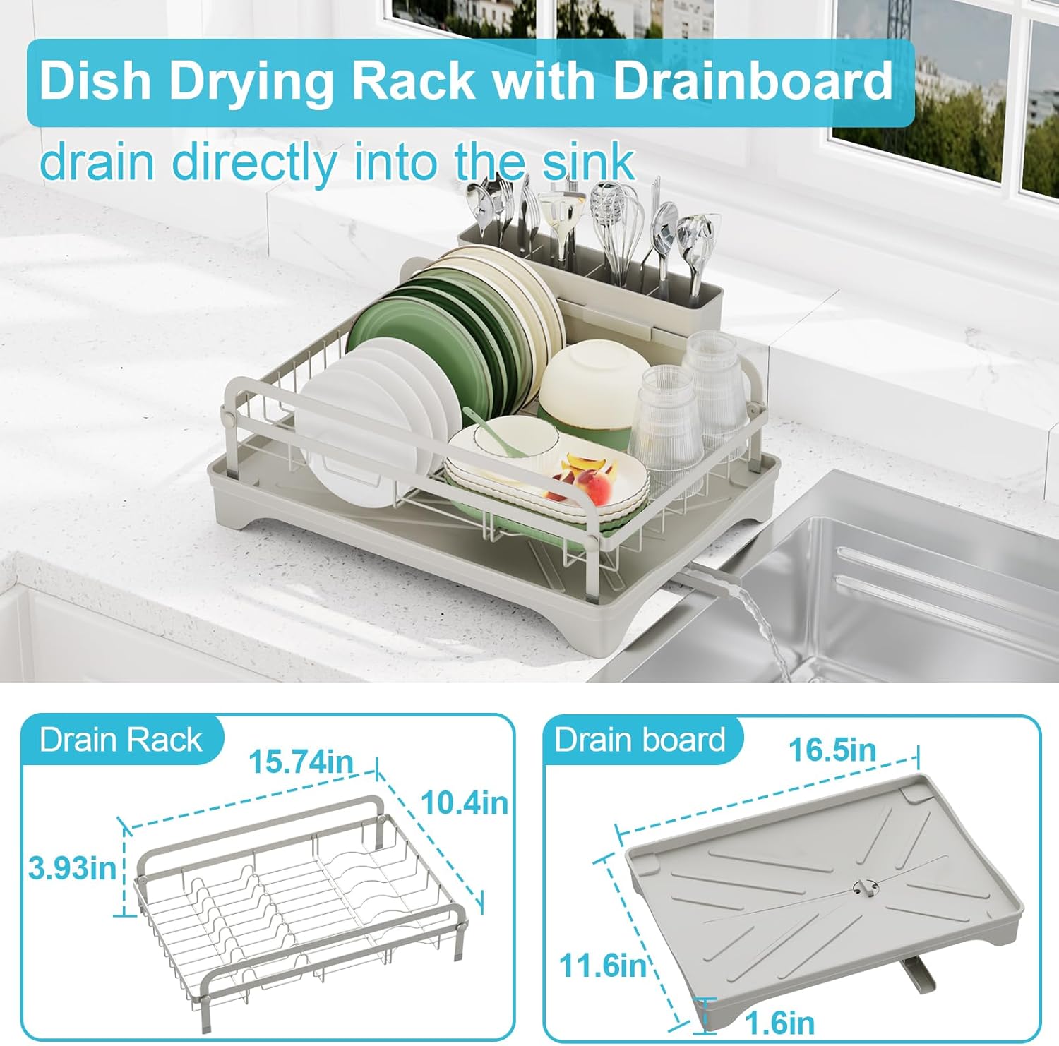 Dish Drying Rack - Space-Saving Dish Rack,Dish Racks for Kitchen Counter with Drainboard,Rustproof Countertop Dish Drainer with Utensil Holder for Sink Grey