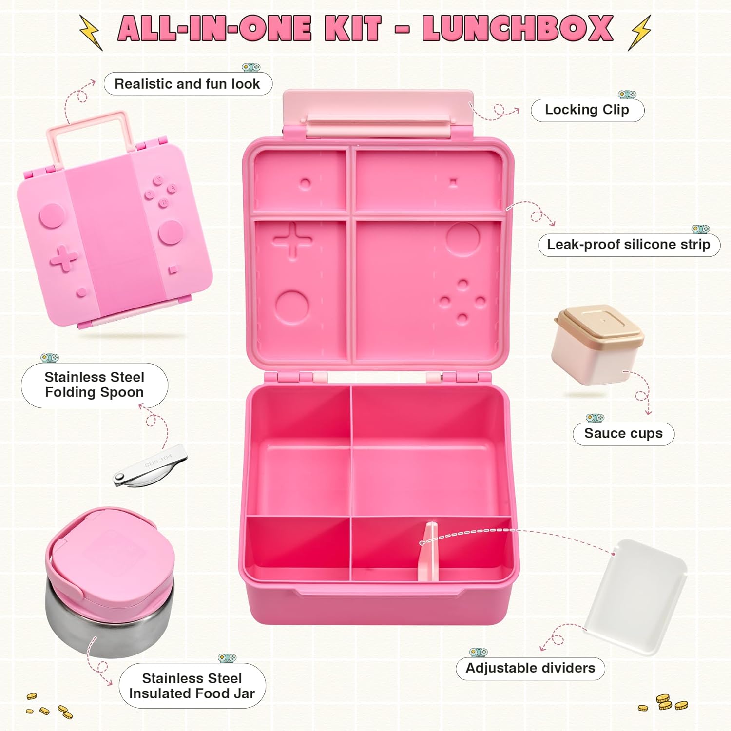 Game Bento Box for Kids, Lunch Box with Thermo(9oz Food Jar), Folding Spoon, Removable Divider & Sauce Cup, Lunch Box Kids for School,Travel, BPA-Free & Realistic Shape (Pink)