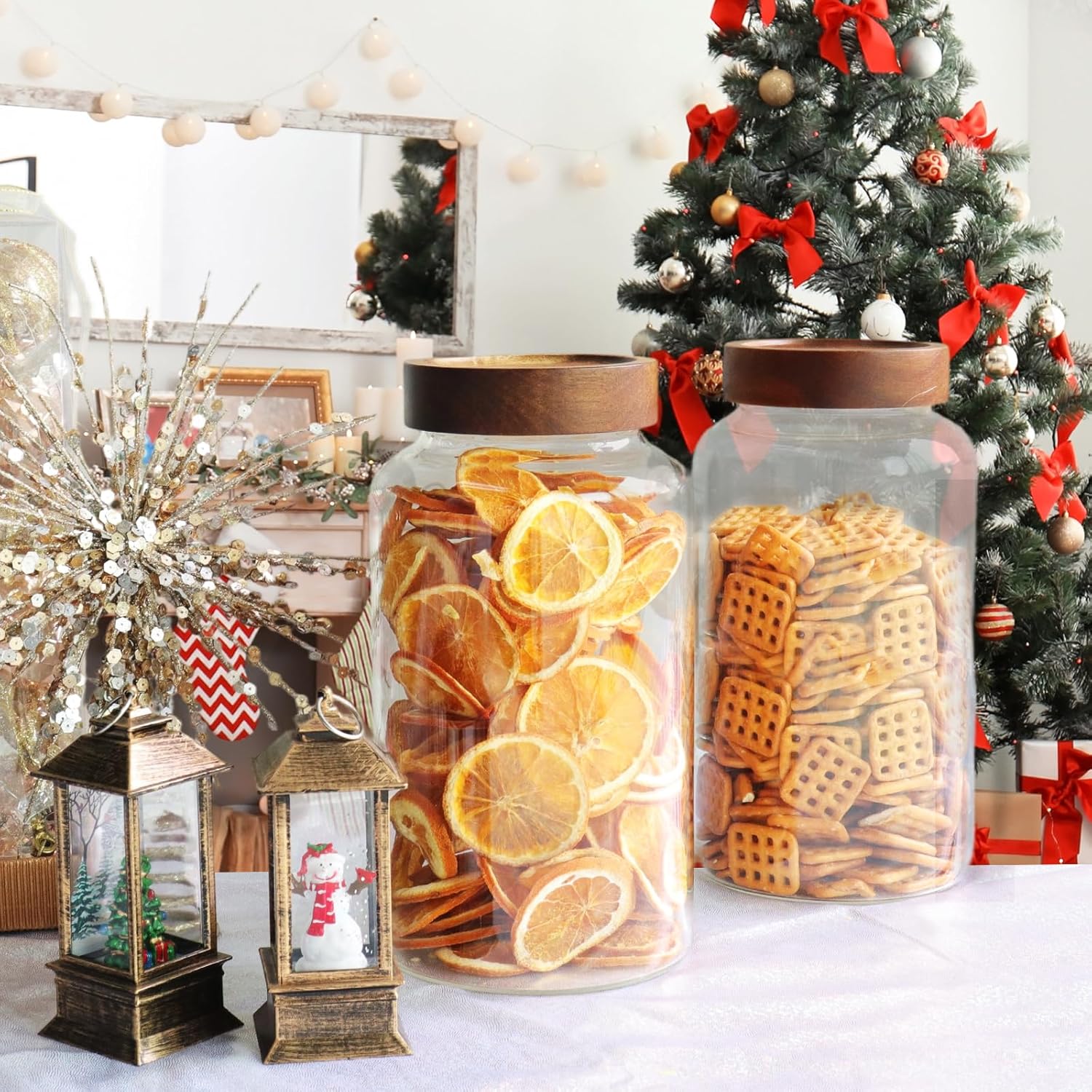 - 【STYLISH & PRACTICAL DESIGN】: Glass food canister for kitchen counter are expertly designed with transparent crystal glass,easy to see what is inside, screw airtight lids are convenient to rotate the lid to open,especially suitable for parties, afternoon tea, dining tables, festivals, baking,outdoor gardens, restaurants, hotels to display.All materials are BPA-free, safe and non-toxic.Easy to clean and save.