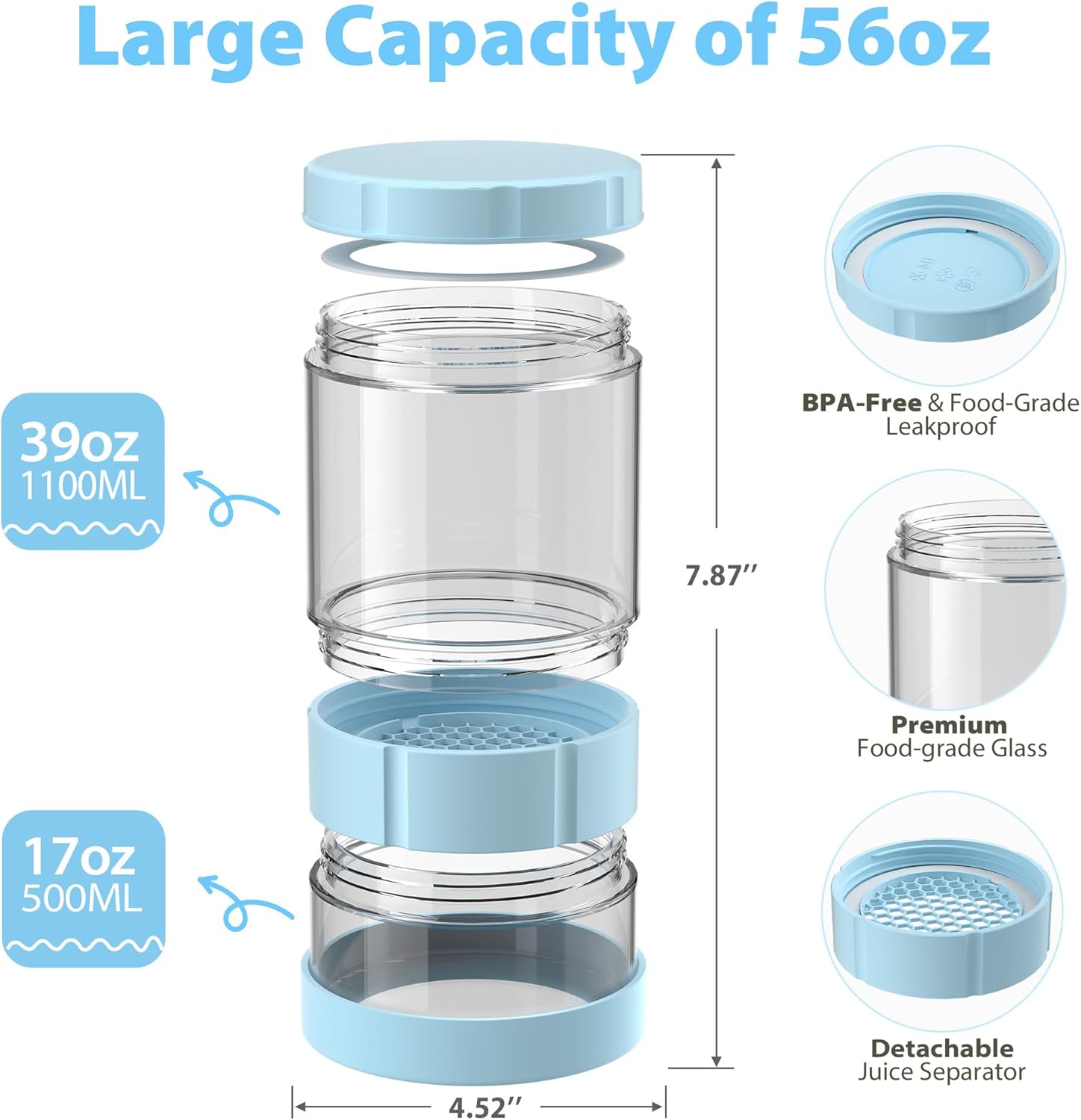 - HIGH QUALITY MATERIALS & LARGE CAPACITY: The olive jar is made of lead-free glass, and the lid and filter are made of BPA-free PP plastic to ensure safety and long-lasting durability. All components are dishwasher safe, refrigerator safe, recyclable, and durable. The pickle jar with strainer has a large capacity of 1600 ml/56 oz, with the top half having a capacity of 1100 ml/38.7 oz and the bottom half having a capacity of 500 ml/17.6 oz to meet the large capacity demand