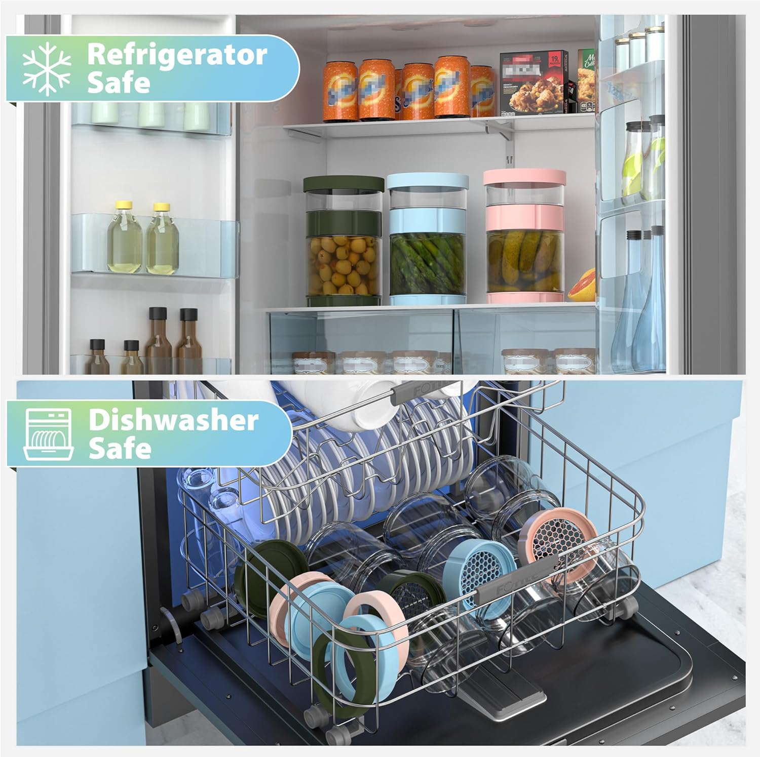 - LEAK-PROOF & NON-SLIP DESIGN: The lid and strainer are equipped with food-grade sealing silicone rings to ensure premium airtightness and leak-proofness. The bottom of the pickling jars comes with a soft, non-slip silicone sleeve, which allows the pickle container to be placed securely, safe for use on the tabletop, in the refrigerator or the cabinet, and will not slide easily