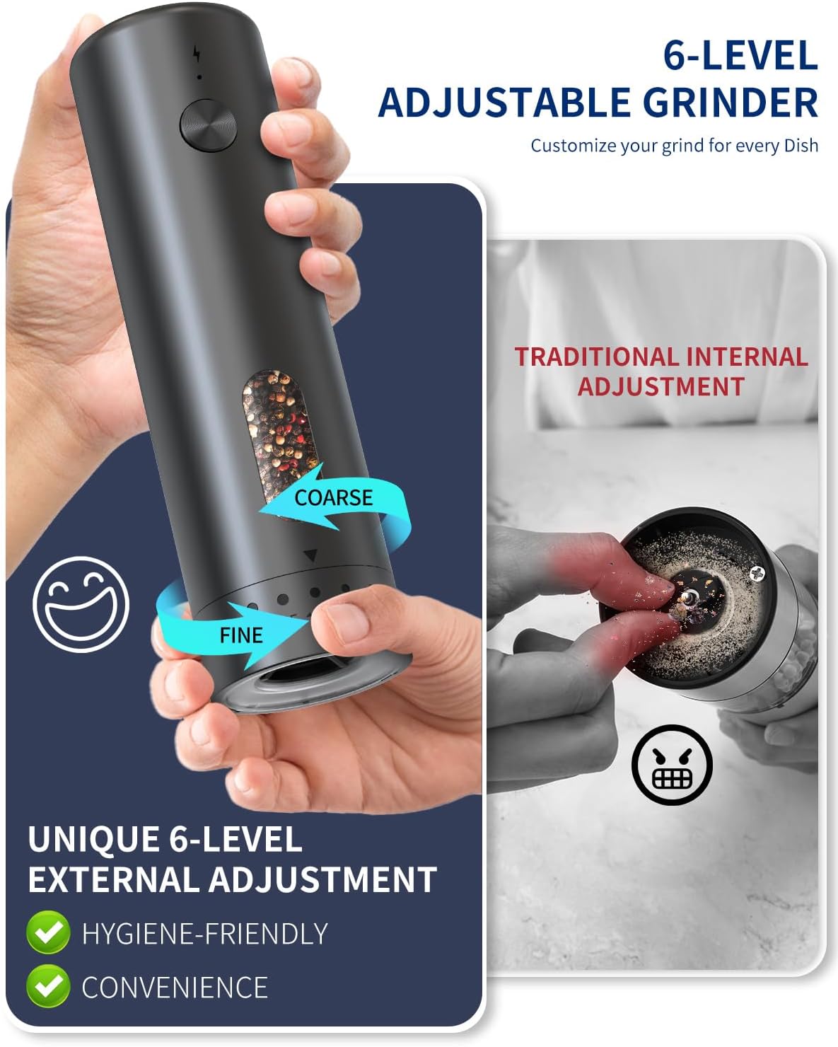 - 【UPGRADED EXTERNAL GRIND SETTING】This rechargeable salt and pepper grinder set features an innovative external coarseness adjustment, so there’s no need to touch the grinding head. It's easy to use—even with manicured nails—offering a cleaner, more hygienic experience. A great choice for health-conscious users