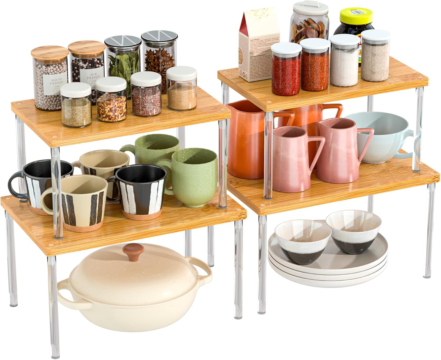 Jolitac Cabinet Organizer Shelf - Set of 4 Clear Acrylic Spice Rack, Stackable Pantry Storage Shelves for Kitchen Counter, Bathroom, Desk - Multi-Purpose Bamboo Space Saving Shelves, Easy Assembly