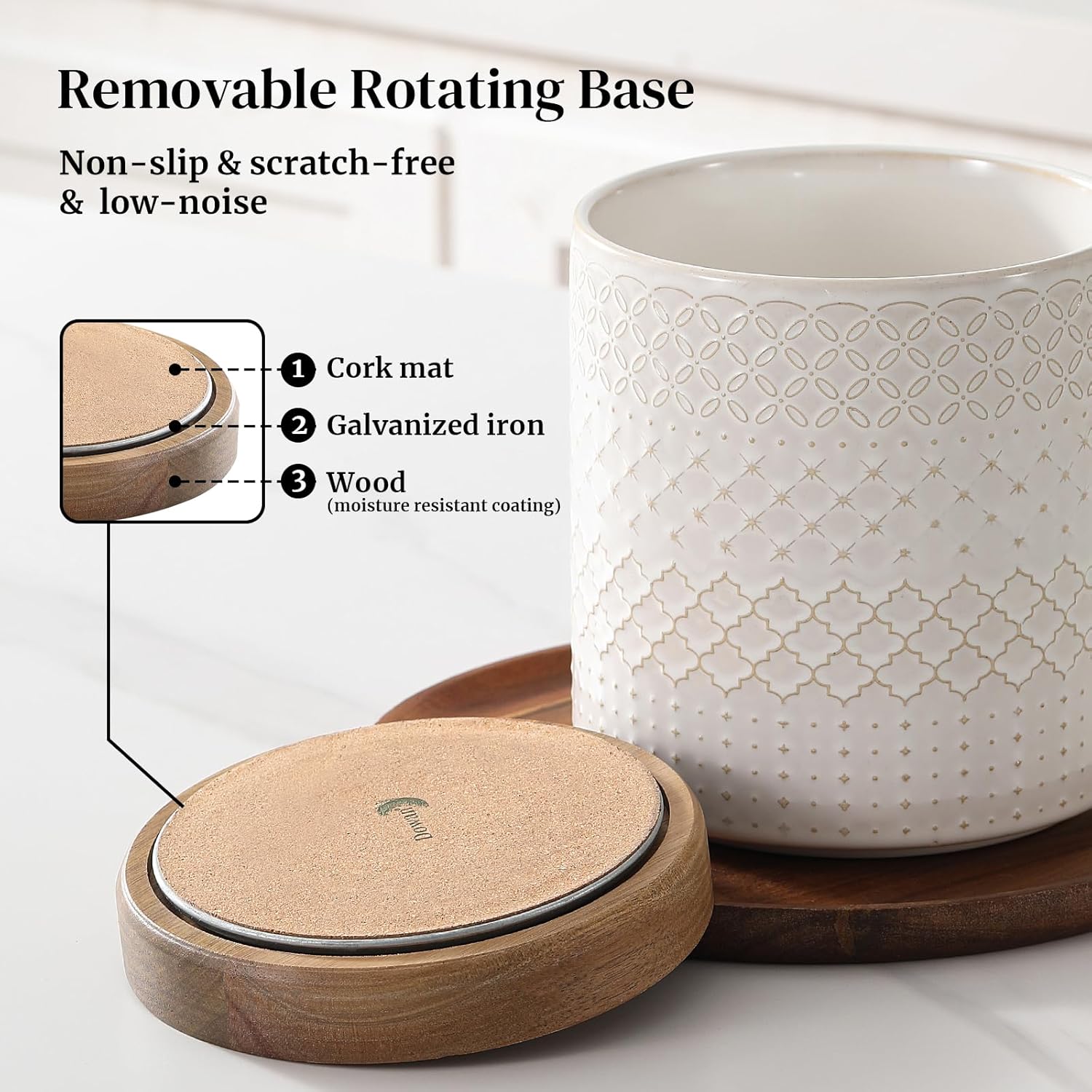 DOWAN 360° Rotating Extra Large Cooking Utensil Holder, 7.6" Kitchen Utensil Holder for Countertop, Utensil Crock for Farmhouse Kitchen Decor, Ceramic Stable Utensil Caddy, White Embossed
