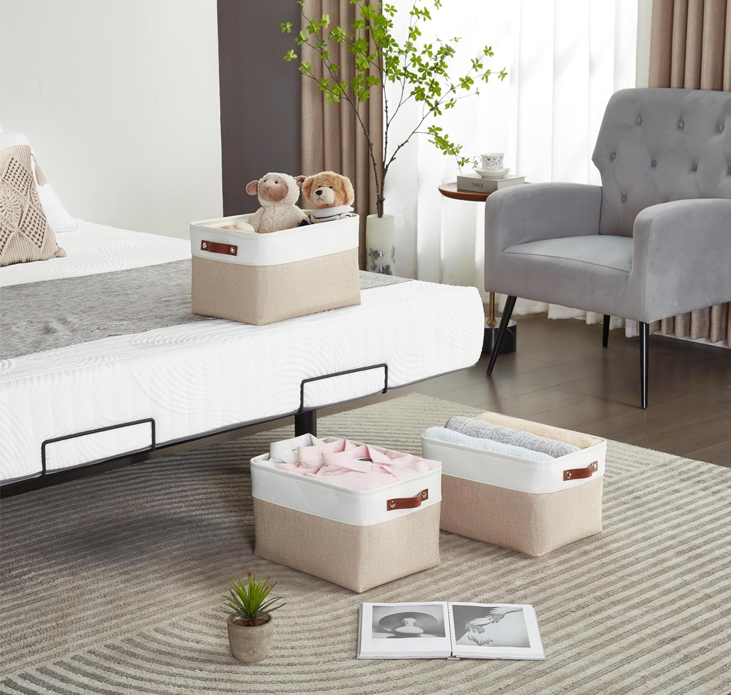 - Sturdy Construction: DECOMOMO closet storage bins are reinforced with upper metal frame and 2.5mm MDF fiberboard bottom to keep the baskets upright. Comes with dual faux leather handles with the weight bearing capacity of 25 lbs.